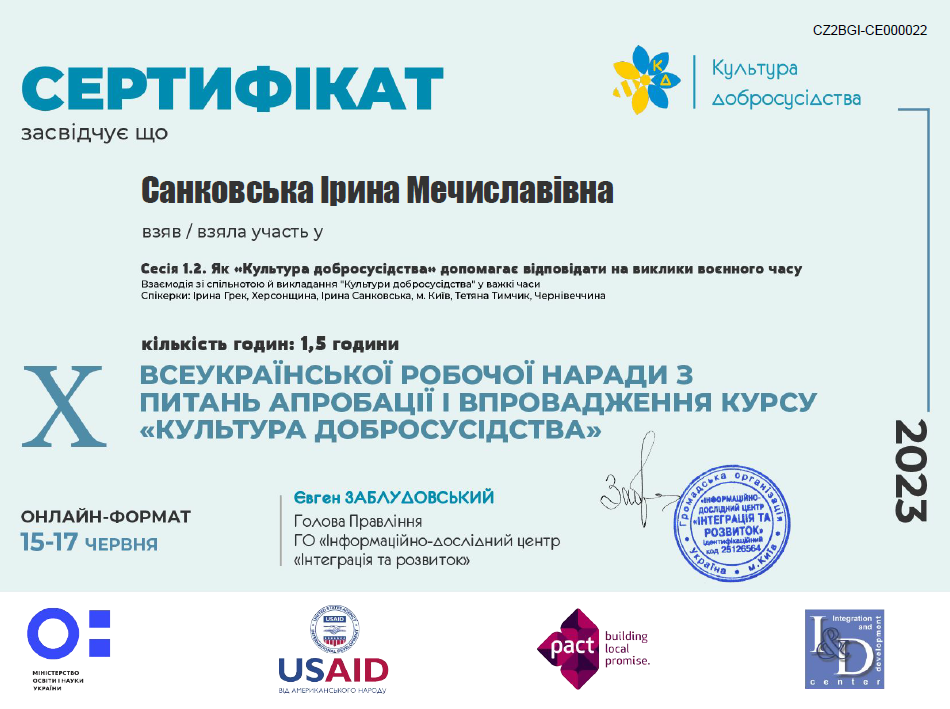 | 37445 | Освітня програма інтегрованого курсу «Культура добросусідства» для 1–2 класів (І цикл) закладів загальної середньої освіти | |
