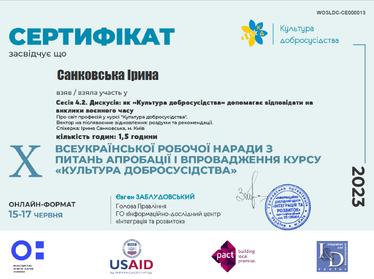 | 10117 | Х Всеукраїнська робоча нарада з питань апробації та впровадження курсу "Культура добросусідства" | Про світ професій у курсі "Культура добрсусідства" | онлайн-формат |