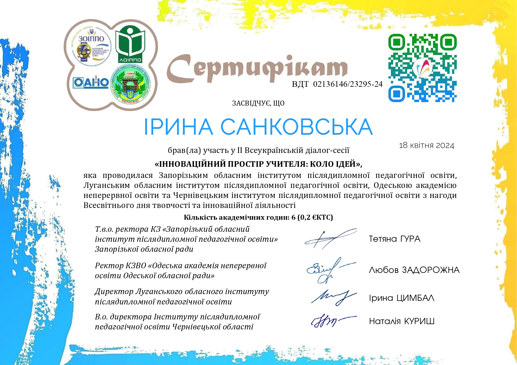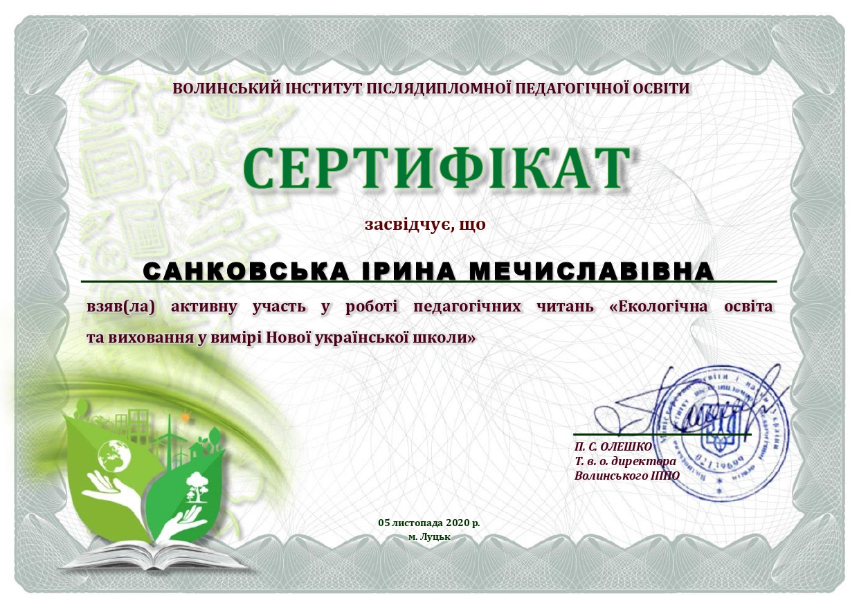 | 948 | Без ступеня | Без звання | Старший викладач | Інститут післядипломної освіти | 2024 | 132391 | Санковська_Свідоцтвопро_АП_Кліматична абетка-1.pdf |