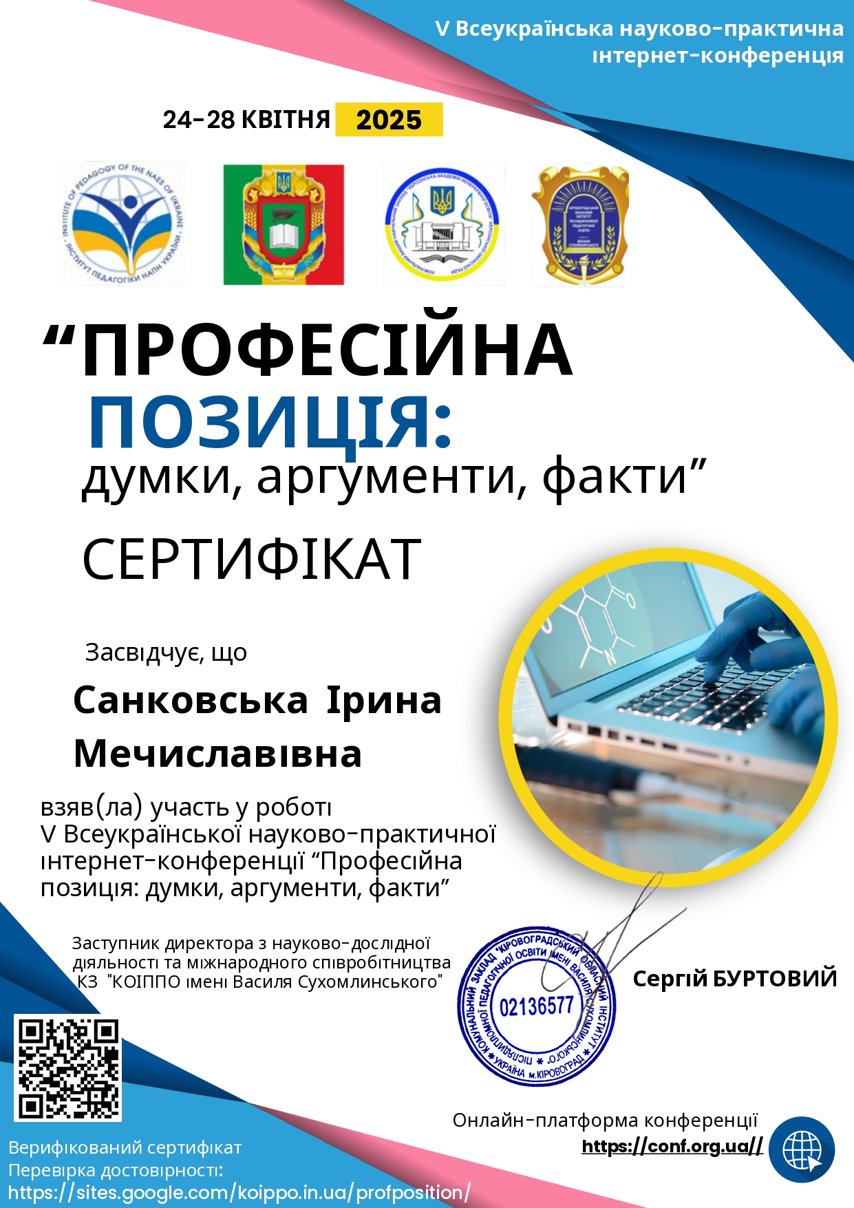 | 11822 | V Всеукраїнська науково-практична інтернет-конференція «Професійна позиція: думки, аргументи, факти» | Цифрова трансформація освіти як виклик системі ІПО та ЗВО | Кропивницький |