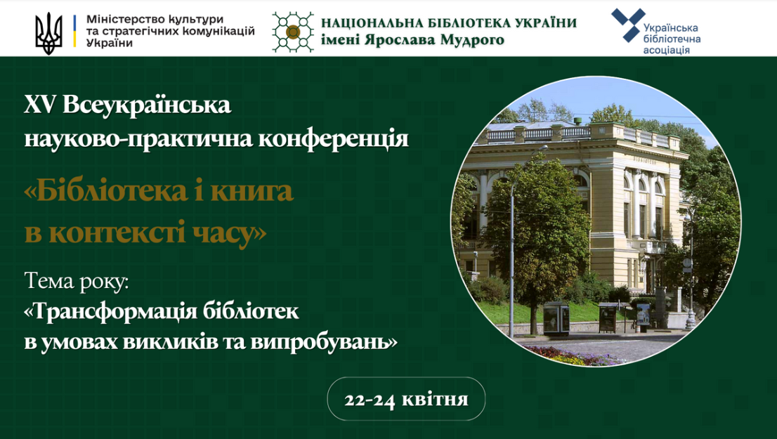 | 12852 | XV Всеукраїнська науково-практична конференція "Бібліотека і книга в контексті часу. Трансформація бібліотек в умовах викликів та випробувань" | Бібліотека як партнер у роботі з літературою екологічного і кліматичного змісту | Київ |