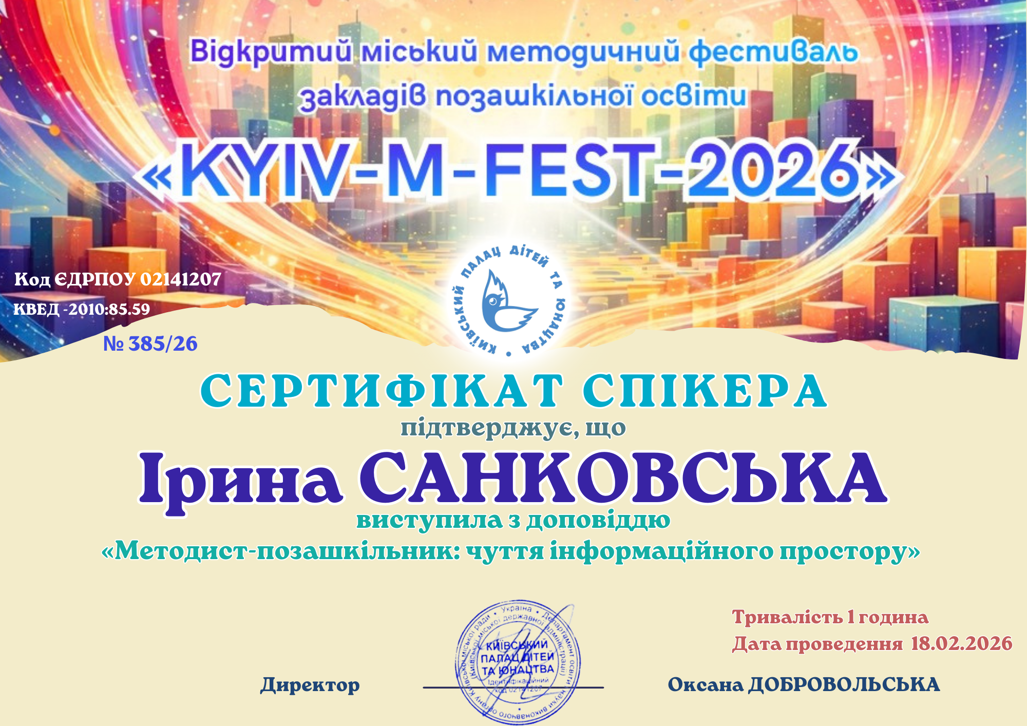 | 13115 | Міський методичний фестиваль закладів позашкільної освіти | Методист-позашкільник: чуття інформаційного простору | Київ |