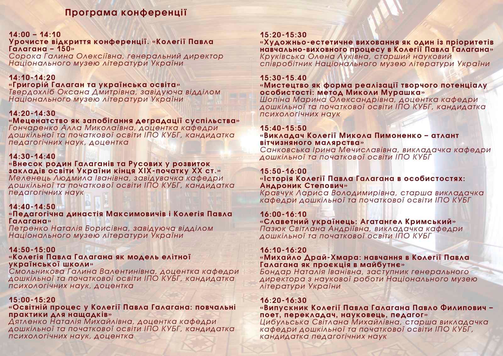 | 7090 | Колегія Павла Ґалаґана в культурному й освітньому просторі кінця ХІХ - поч. ХХ ст. (до 150-річчя Колегії Павла Ґалаґана) | Викладач Колегії Микола Пимоненко - атлант вітчизняного малярства | Київ |