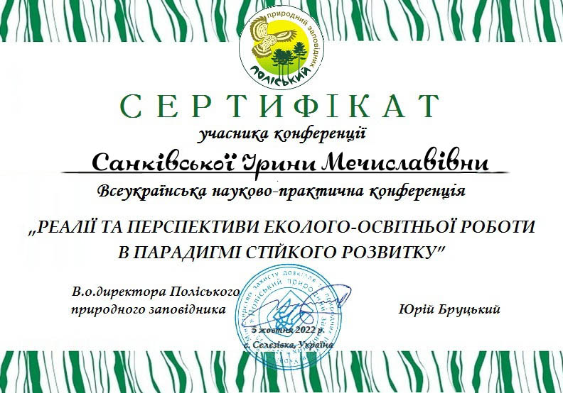 | 9867 | Всеукраїнська науково-практична конференція "Перспективи еколого-освітньої роботи в парадигмі стійкого розвитку" | Ресурси для еколого-освітньої роботи в початковій школі | С.Селезівка, Овруцький район, Житомирська область |