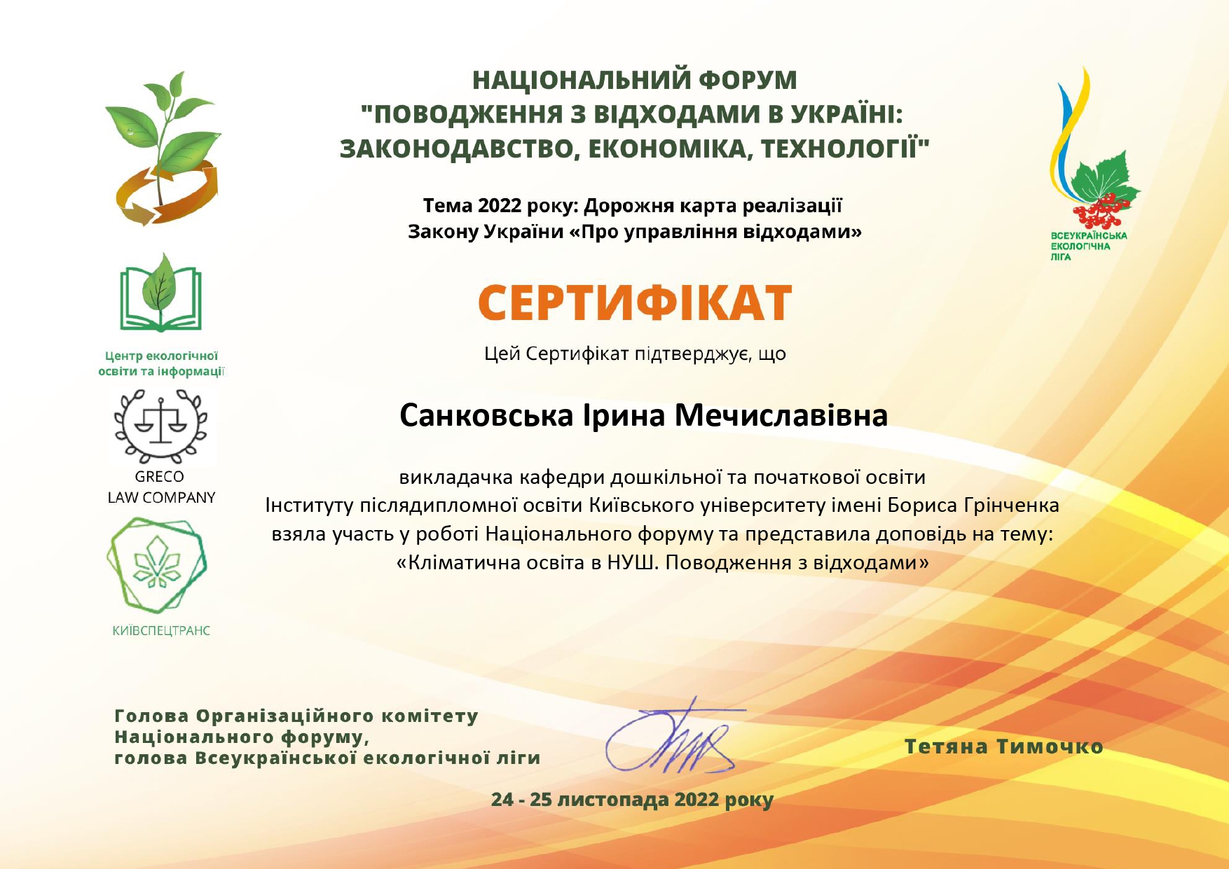 | 9874 | Всеукраїнський форум "Освіта для збалансованого розвитку" | Актуальність кліматичної освіти як складової екологічної освіти всіх рівнів на етапі післявоєнної відбудови та розвитку України | Київ | document.pdf | |