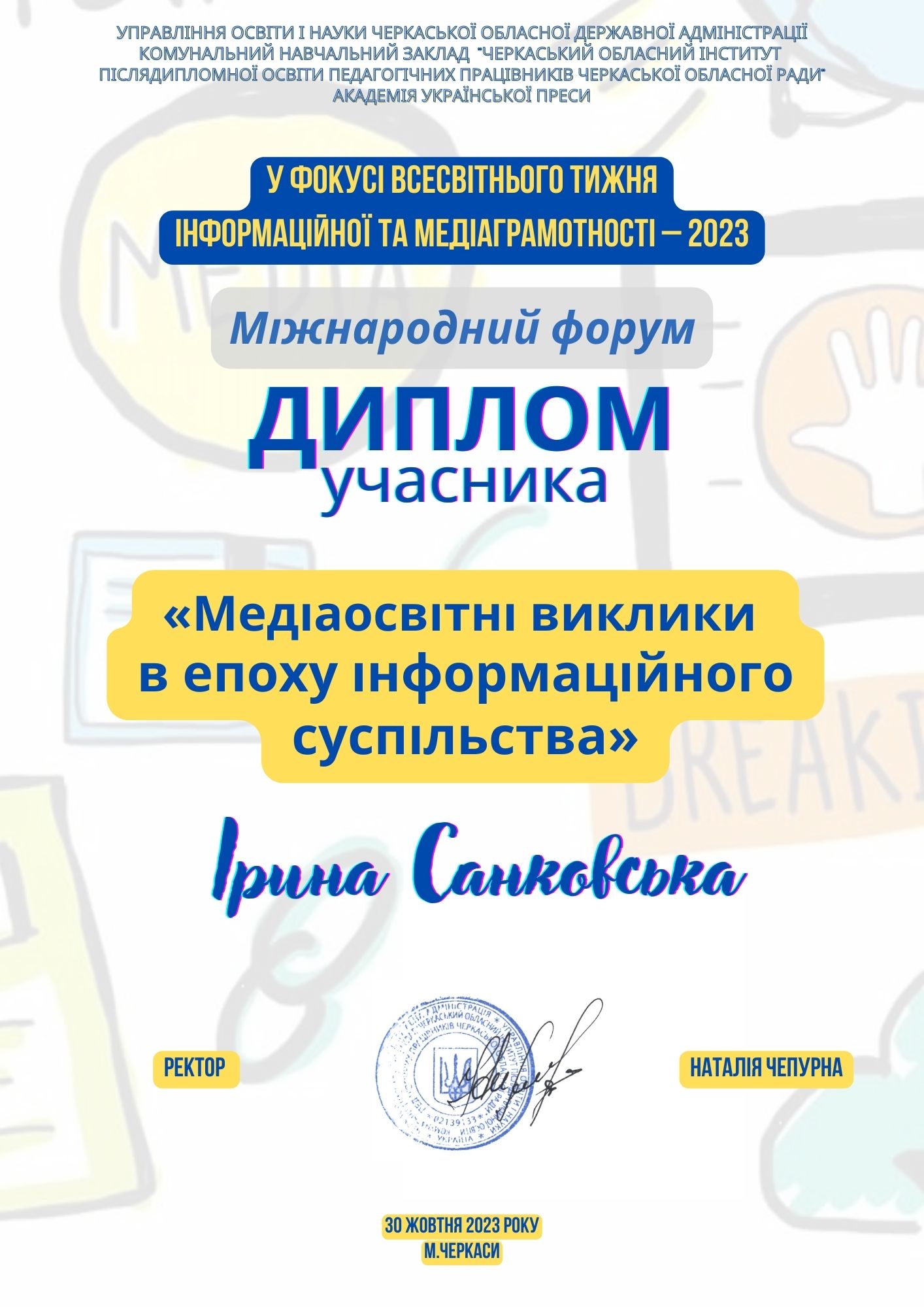 | 9876 | Міжнародний форум "Медіаосвітні виклики в епоху інформаційного суспільства" | Медіаграмотність у роботі з кліматичною інформацією | м. Черкаси |