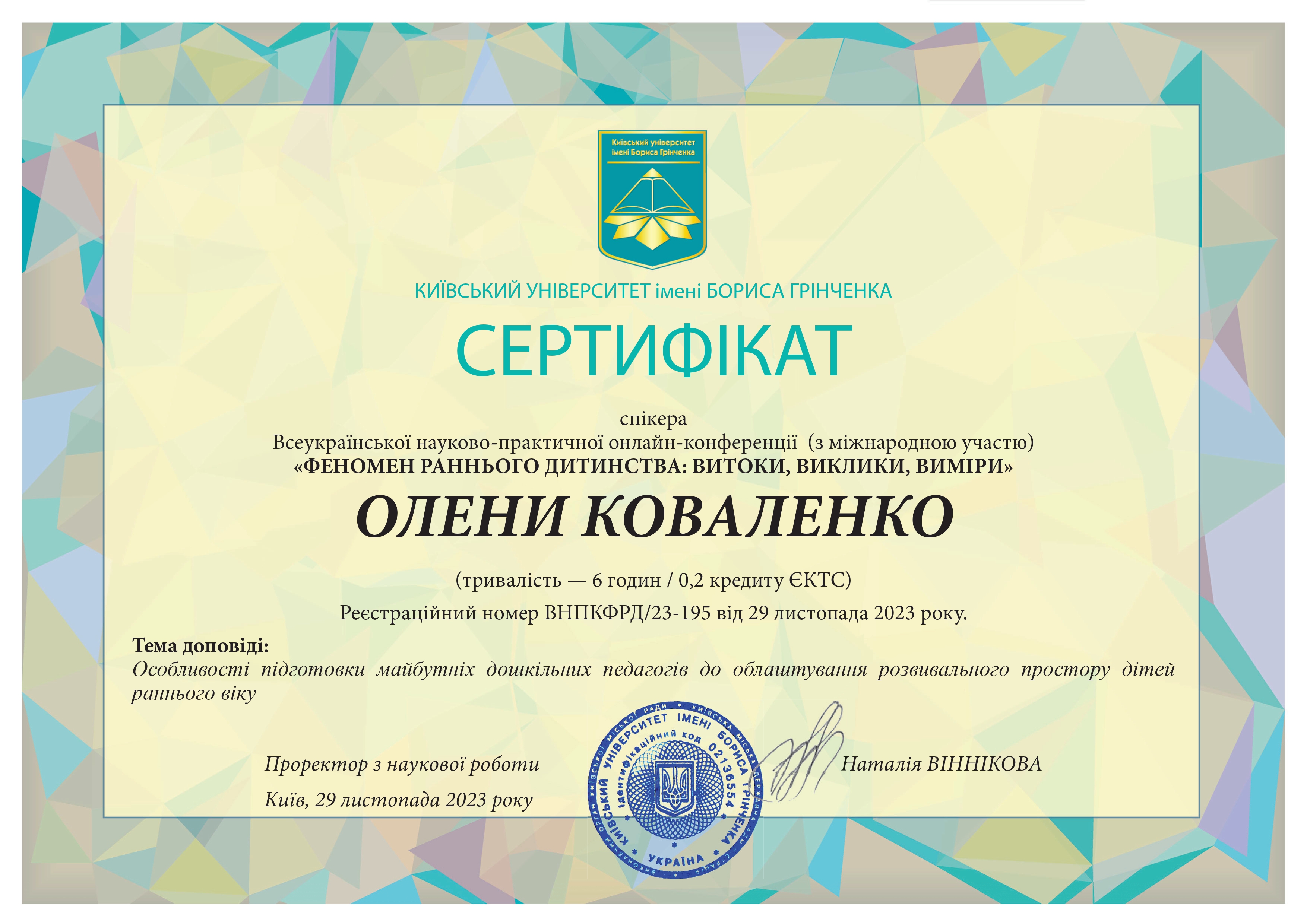 | 10121 | Феномен раннього дитинства: витоки, виклики, виміри | Особливості підготовки майбутніх дошкільних педагогів до облаштування розвивального простору дітей раннього віку | Київський університет імені Бориса Грінченка |