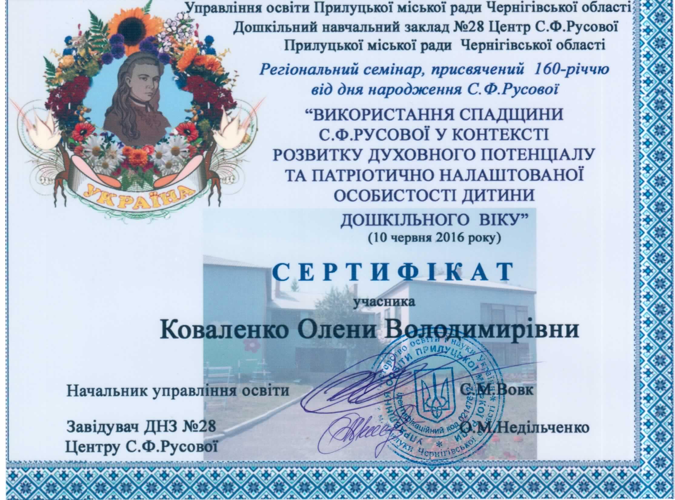 | 266 | Регіональний семінар, присвячений 160-річчю від дня народження С.Ф.Русової | Виховання дітей 'на національному грунті' за ідеями С.Ф.Русової в умовах трансформації суспільства | ДНЗ №28 Центр С..Ф. Русової |