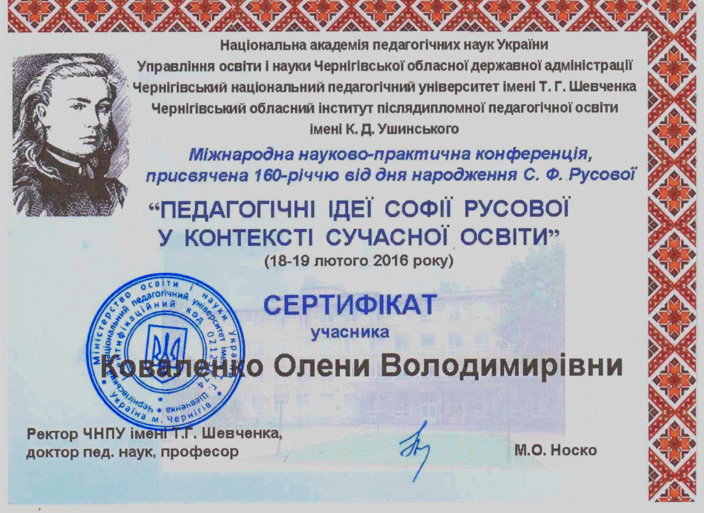 | 267 | ПЕДАГОГІЧНІ ІДЕЇ СОФІЇ РУСОВОЇ У КОНТЕКСТІ СУЧАСНОЇ ОСВІТИ | Концепція українського дитячого садка С.Ф.Русової та її розвиток у сучасних умовах | Чернігівський обласний інститут післядипломної педагогічної освіти імені К.Д.Ушинського |