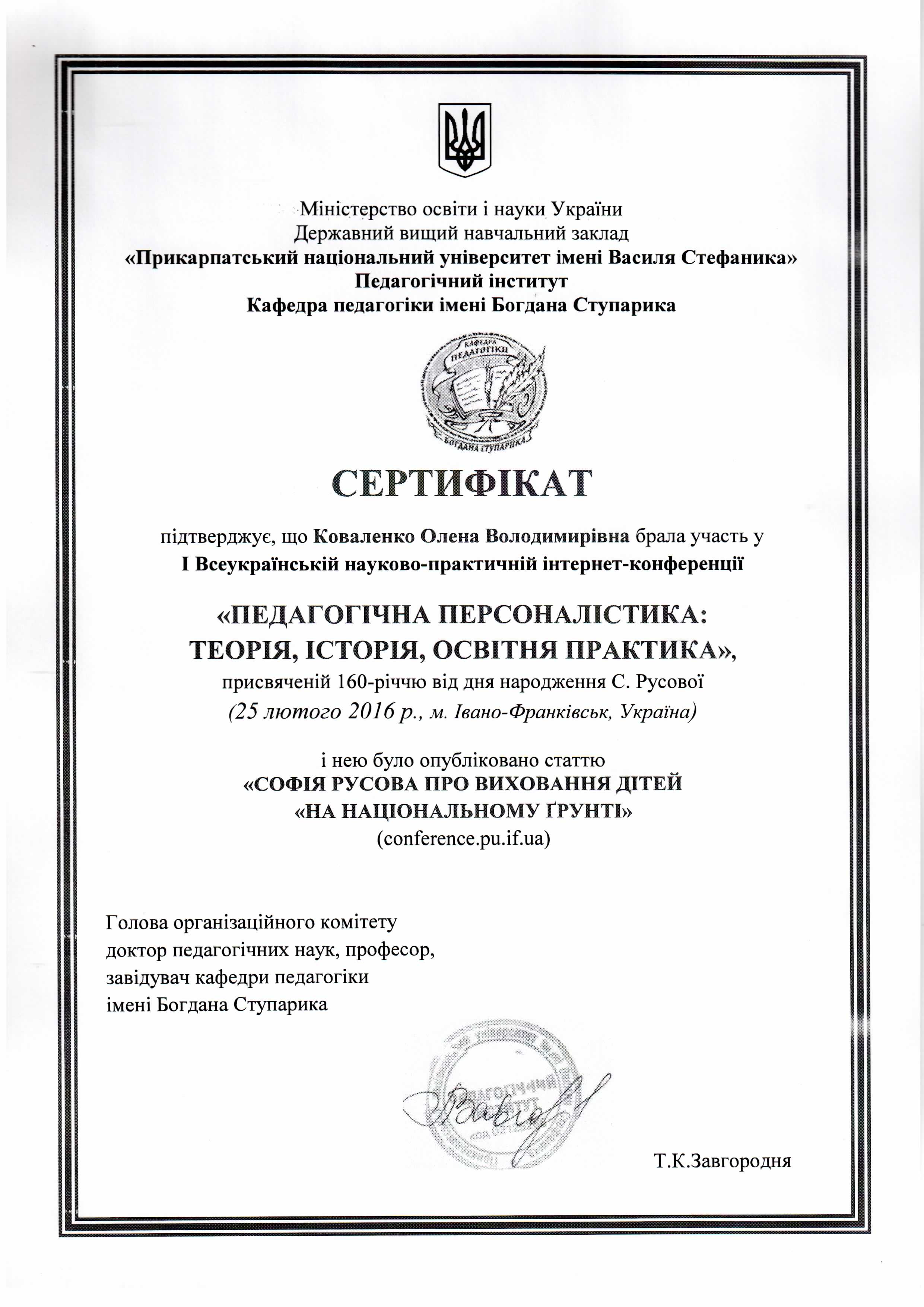 | 269 | ПЕДАГОГІЧНА ПЕРСОНАЛІСТИКА: ТЕОРІЯ, ІСТОРІЯ, ОСВІТНЯ ПРАКТИКА' | СОФІЯ РУСОВА ПРО ВИХОВАННЯ ДІТЕЙ 'НА НАЦІОНАЛЬНОМУ ҐРУНТІ' | Прикарпатський національний університет імені Богдана Ступарика' |