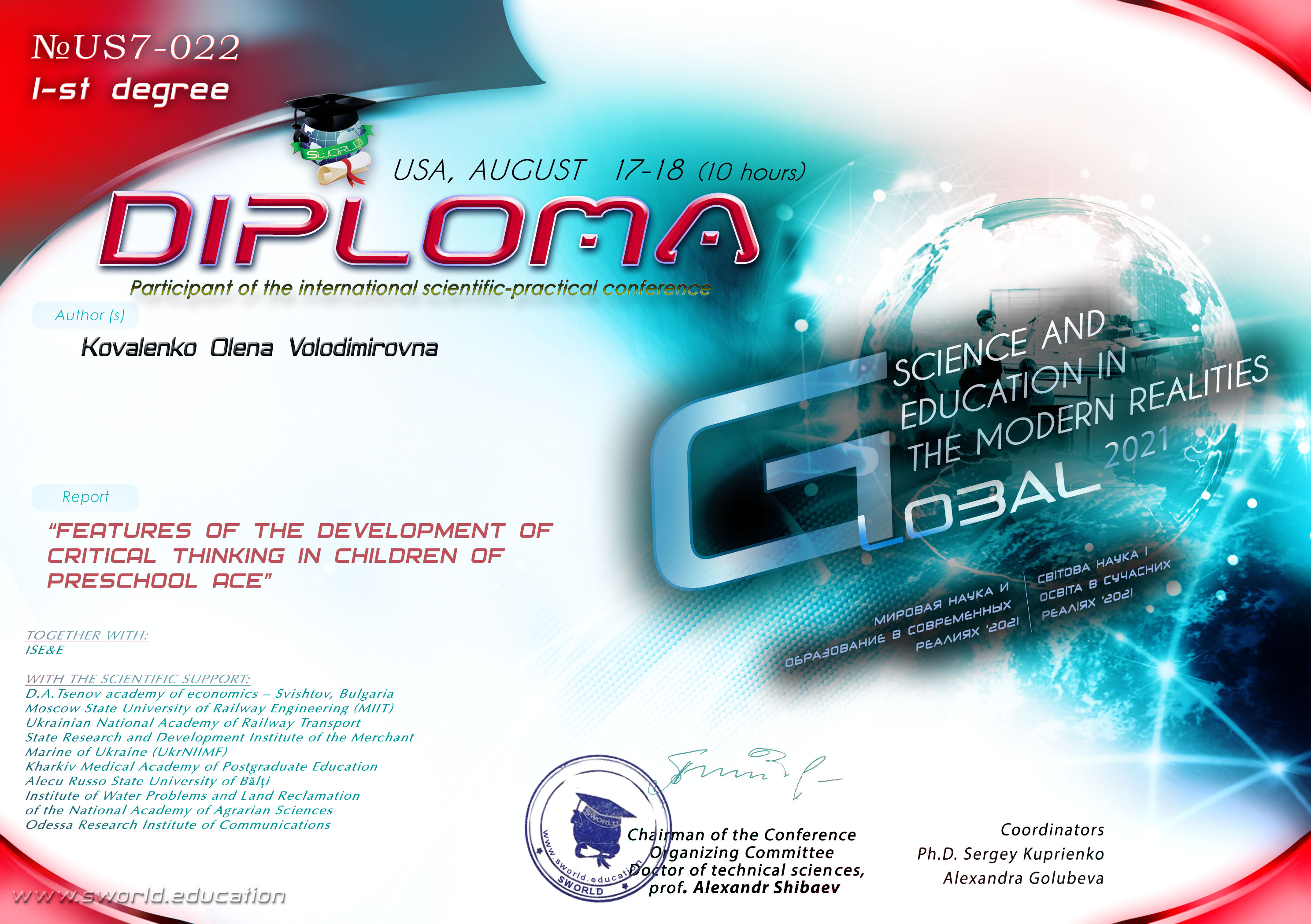 | 7277 | Global science and education in the modern realities» | Особливості розвитку критичного мислення у дітей дошкільного віку | Seattle, Washington, USA |