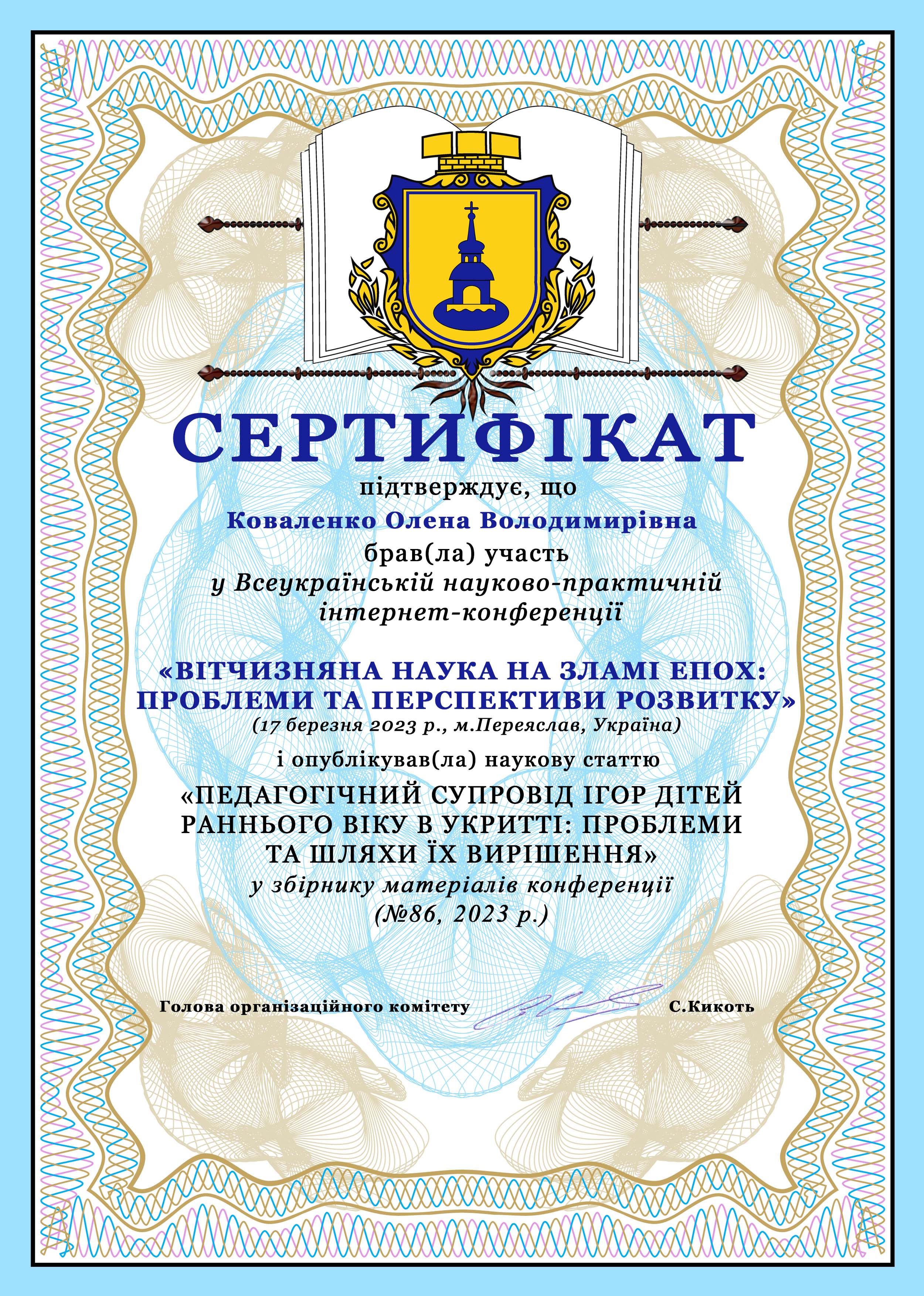 | 8981 | Вітчизняна наука на зламі епох: проблеми та перспективи розвитку | Педагогічний супровід ігор дітей раннього віку в укритті: проблеми та шляхи їх вирішення | Університет Григорія Сковороди в Переяславі |