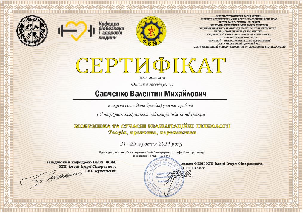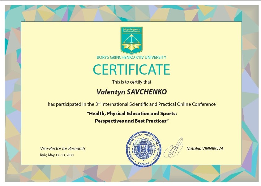 | 4537 | Міжнародна науково-практична конференція «ЗДОРОВ’Я, ФІЗИЧНЕ ВИХОВАННЯ І СПОРТ: ПЕРСПЕКТИВИ ТА КРАЩІ ПРАКТИКИ» | Учасник | Київ | document.pdf | |