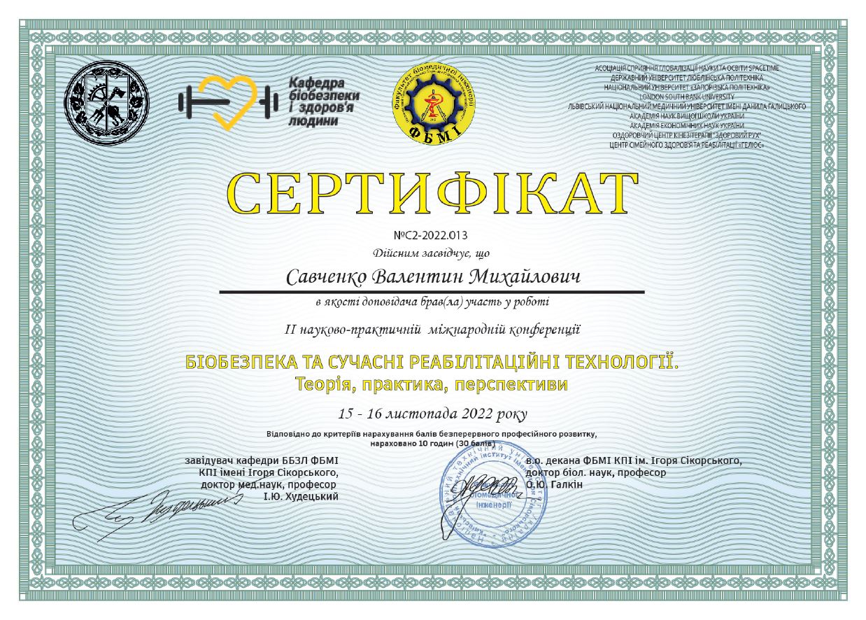 | 7661 | Біобезпека та сучасні реабілітаційні технології "Фізична терапія, ерготерапія, та споріднені реабілітаційні технології". Теорія практика перспективи | Учасник | Київ |