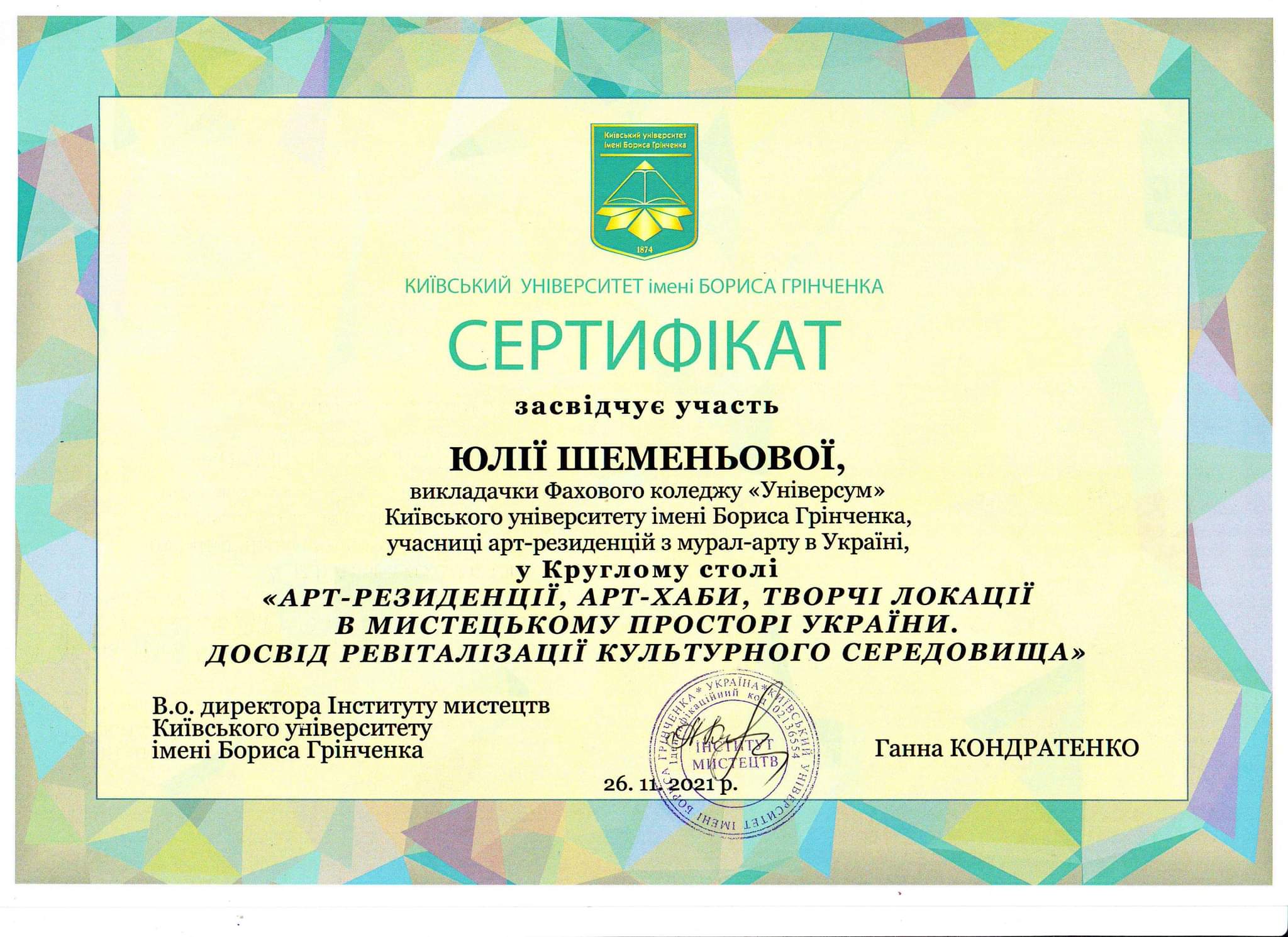 | 7624 | Арт-резиденції, арт-хаби, творчі локації в мистецькому просторі України. Досвід ревіталізації культурного середовища | Ревіталізація мистецького простору сучасними засобами стріт-арту та мурал-арту | Інститут мистецтв Київського університету імені Бориса Грінченка |