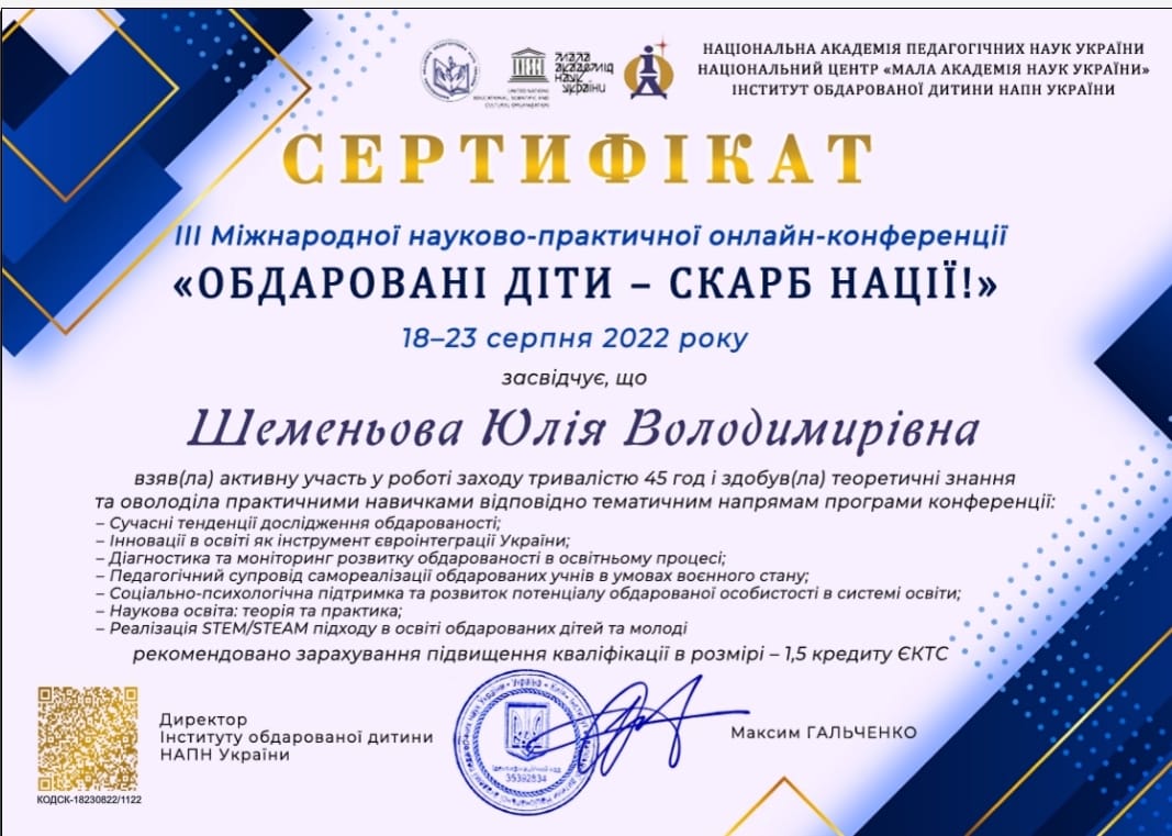 | 8497 | ІІІ міжнародна науково-практична онлайн-конференція “Обдаровані діти — скарб нації” (18-23 серпня 2022 р.). | Pеалізація STEAM-курсу "Наука крізь мистецтво" | Інститут обдарованої дитини НАПН України |