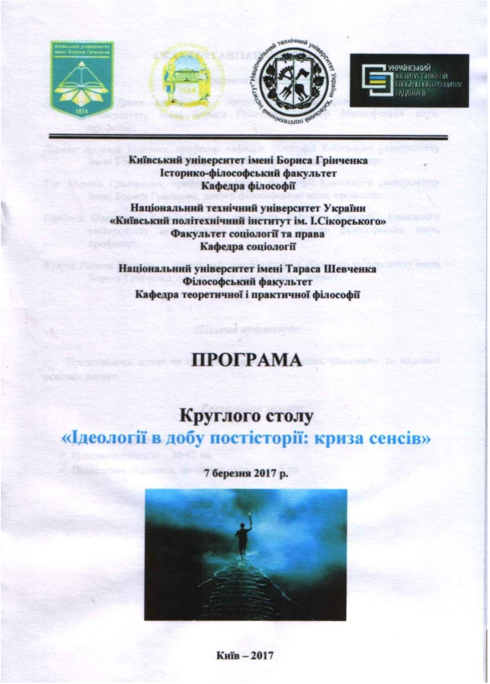 | 1764 | Круглий стіл: "Ідеології в добу постісторії: криза сенсів" | член організаційної ради | м. Київ |