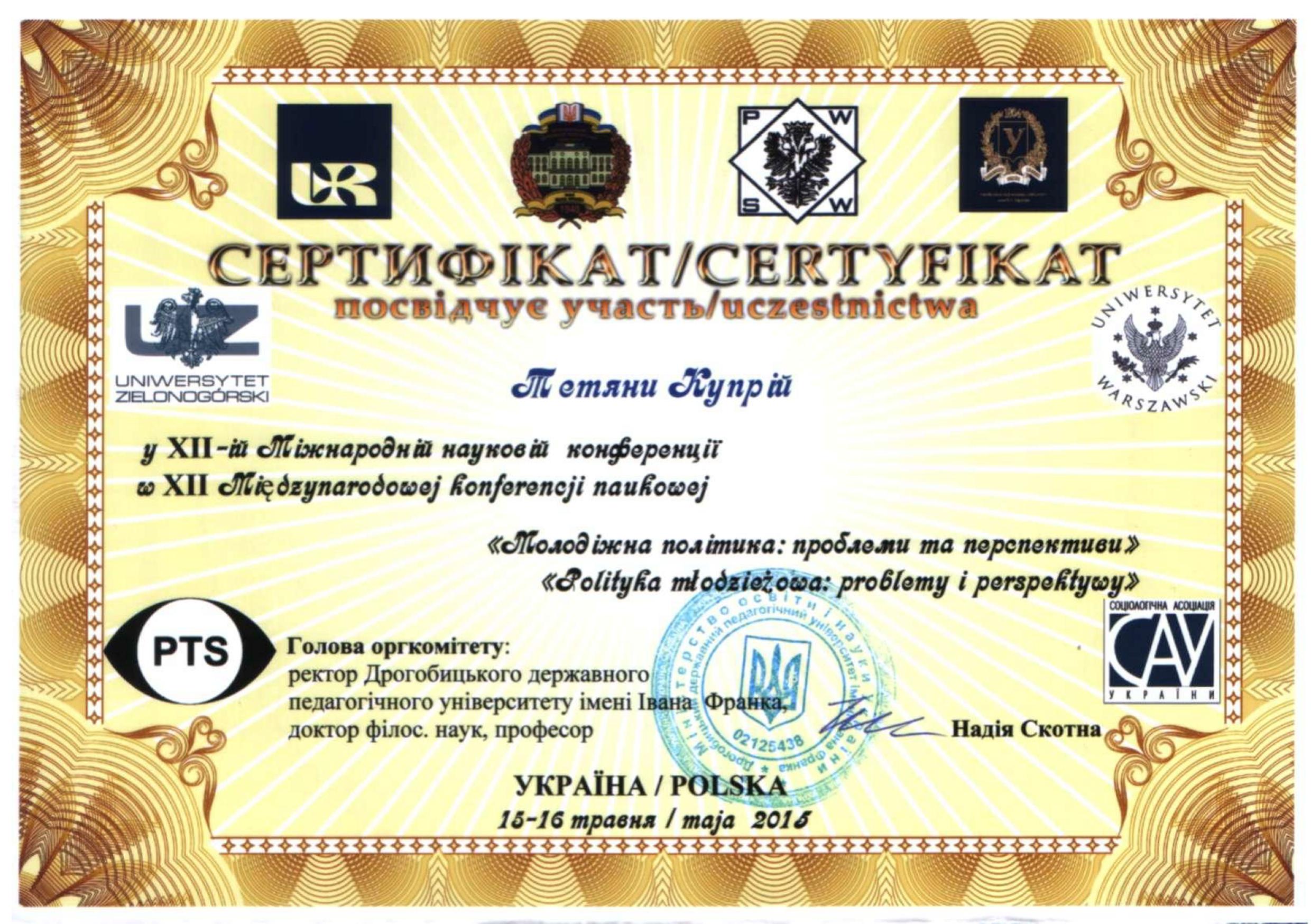 | 352 | XII Міжнародна наукова конференція | Студентоцентроване навчання як рефлексія на модернізацію ринку праці в Україні (на прикладі студентів Київського університету імені Бориса Грінченка) | м. Дрогобич |