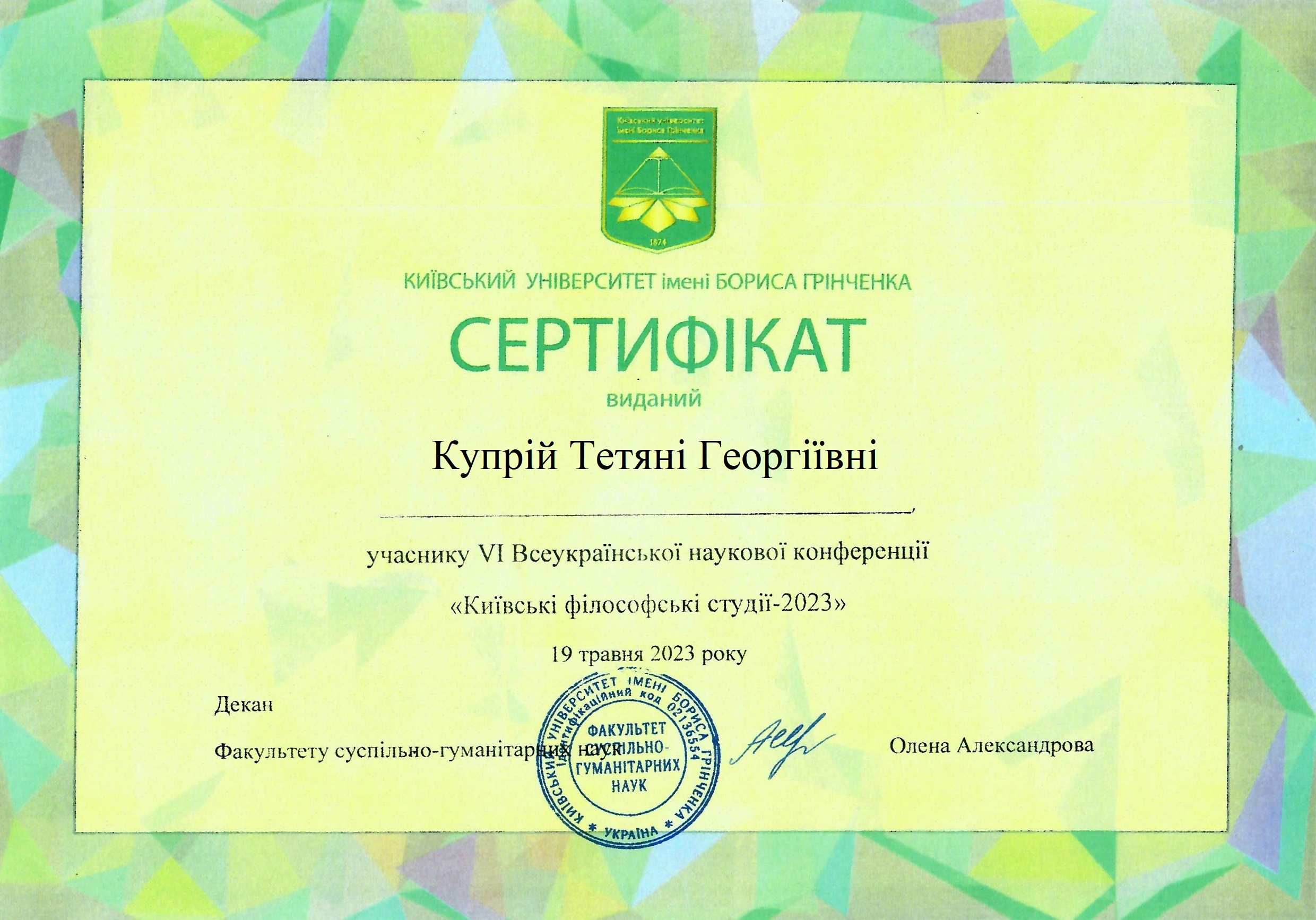 | 413 | Факультет суспільно-гуманітарних наук | Кафедра філософії та релігієзнавства | 119 | 4 | 2025 | https://www.researchgate.net/profile/Tetiana_Kuprii |