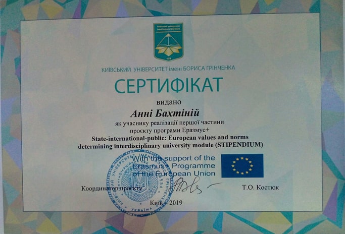 5084 State-international-public: European values and norms determining interdisciplinary university module (STIPENDIUM) учасник реалізації першої частини проєкту програми Еразмус+ Київський університет імені Бориса Грінченка document