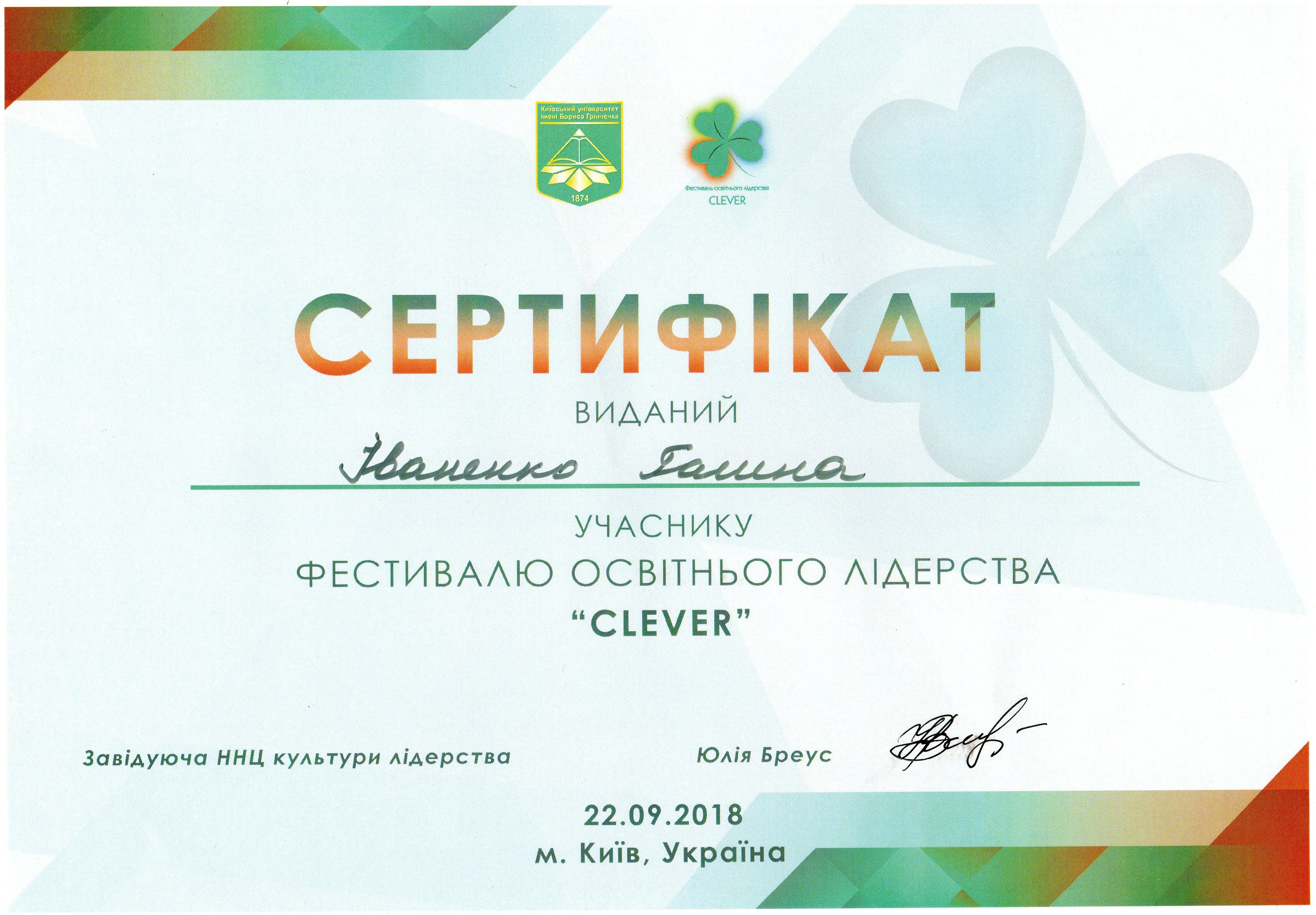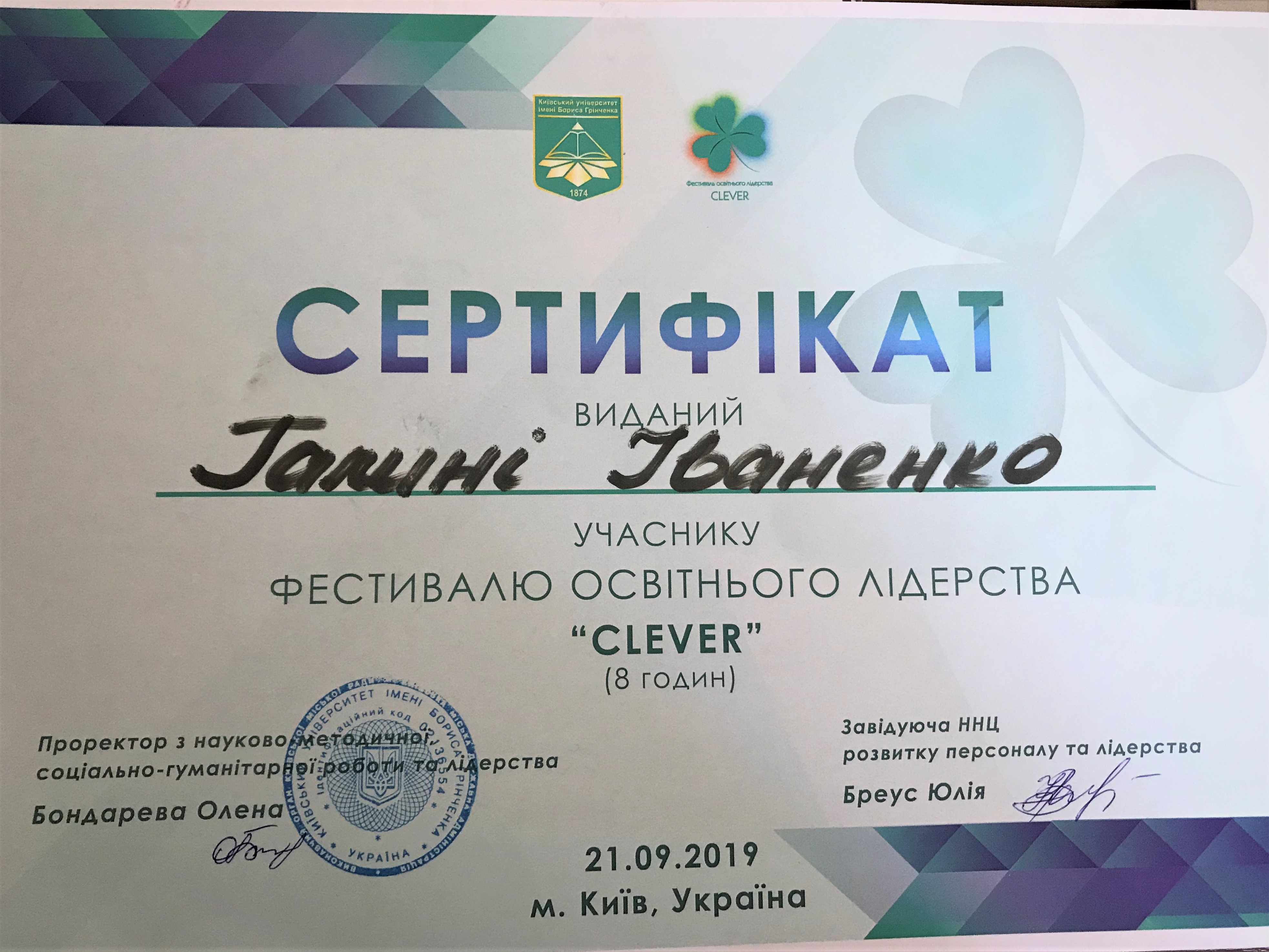 | 4347 | III Фестиваль освітнього лідерства "Clever" | учасник фестивалю | Киїівський університет ім. Б. Грінченка |