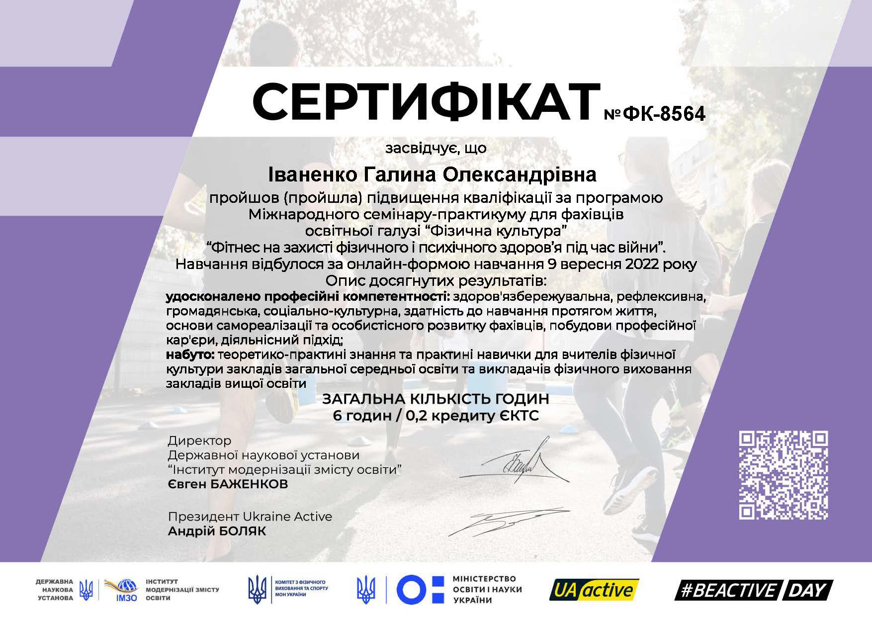 | 8787 | Міжнародний семінар-практикум "Фітнес на захисті фізичного і психічного здоров'я під час війни" | учасник | Київ |