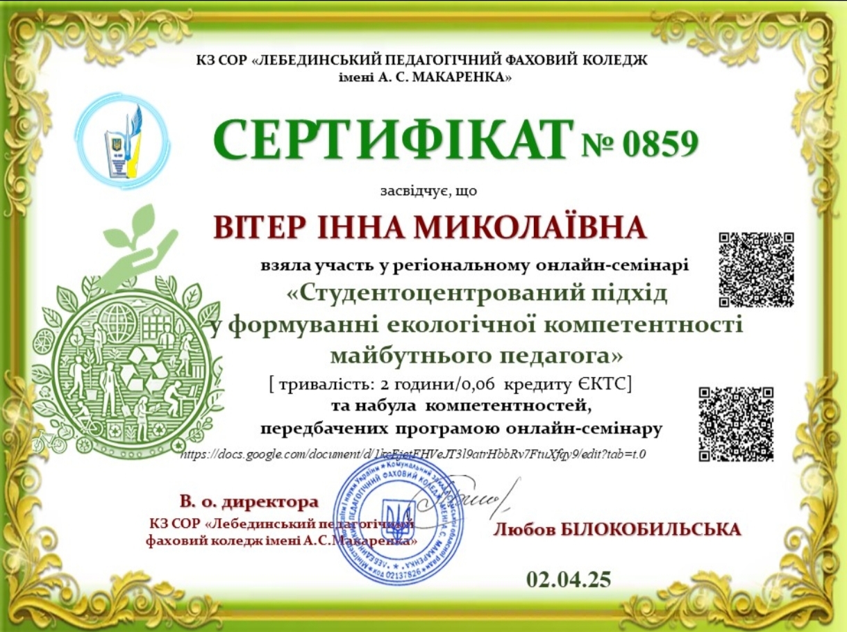 | 12649 | Регіональний онлайн-семінар "Студентоцентрований підхід у формуванні екологічної компетентності майбутнього педагога" | «Особливості реалізації студентоцентрованого освітнього середовища у вищих навчальних закладах | Лебединський фаховий коледж імені А.С. Макаренка |