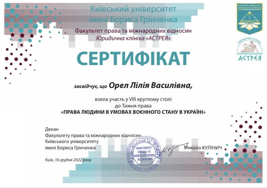 | 8812 | «ПРАВА ЛЮДИНИ В УМОВАХ ВОЄННОГО СТАНУ В УКРАЇНІ» VІІІ круглий стіл до тижня права України | НЕМАЙНОВІ ПРАВА СУБ’ЄКТІВ СТОЛИЦІ | Київський університет імені Бориса Грінченка |