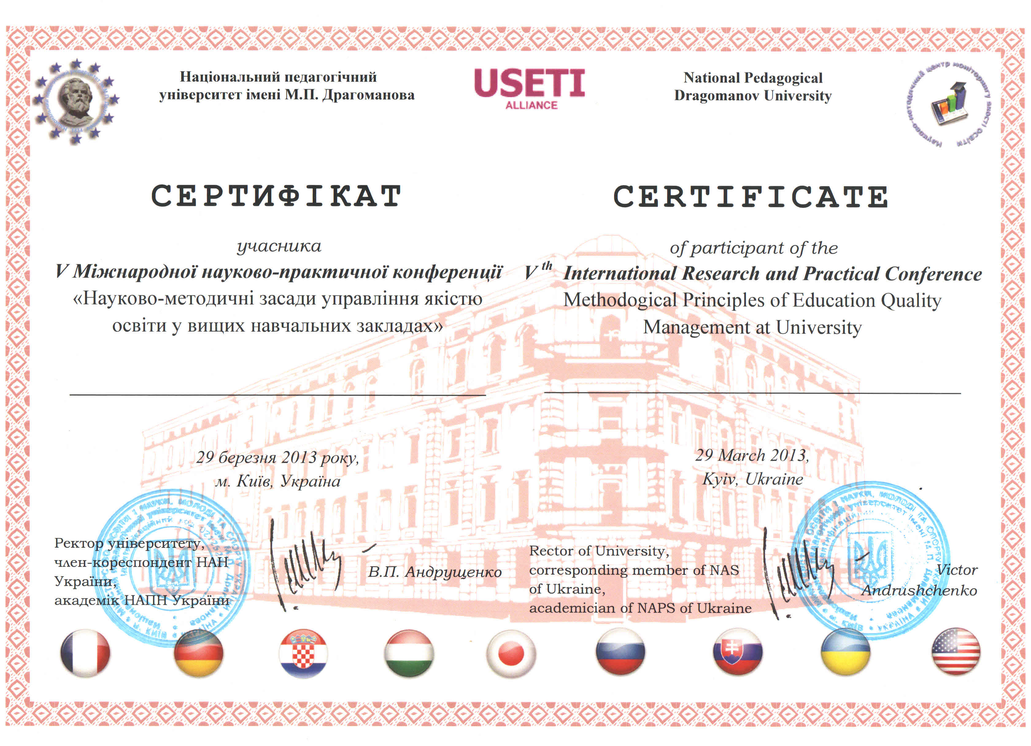 | 1296 | V International Research and Practical Conference Methodogical Principles of Education Quality Management at University | Впровадження інноваційних технологій в відкритому інформаційному просторі сучасного університету | Kyiv |