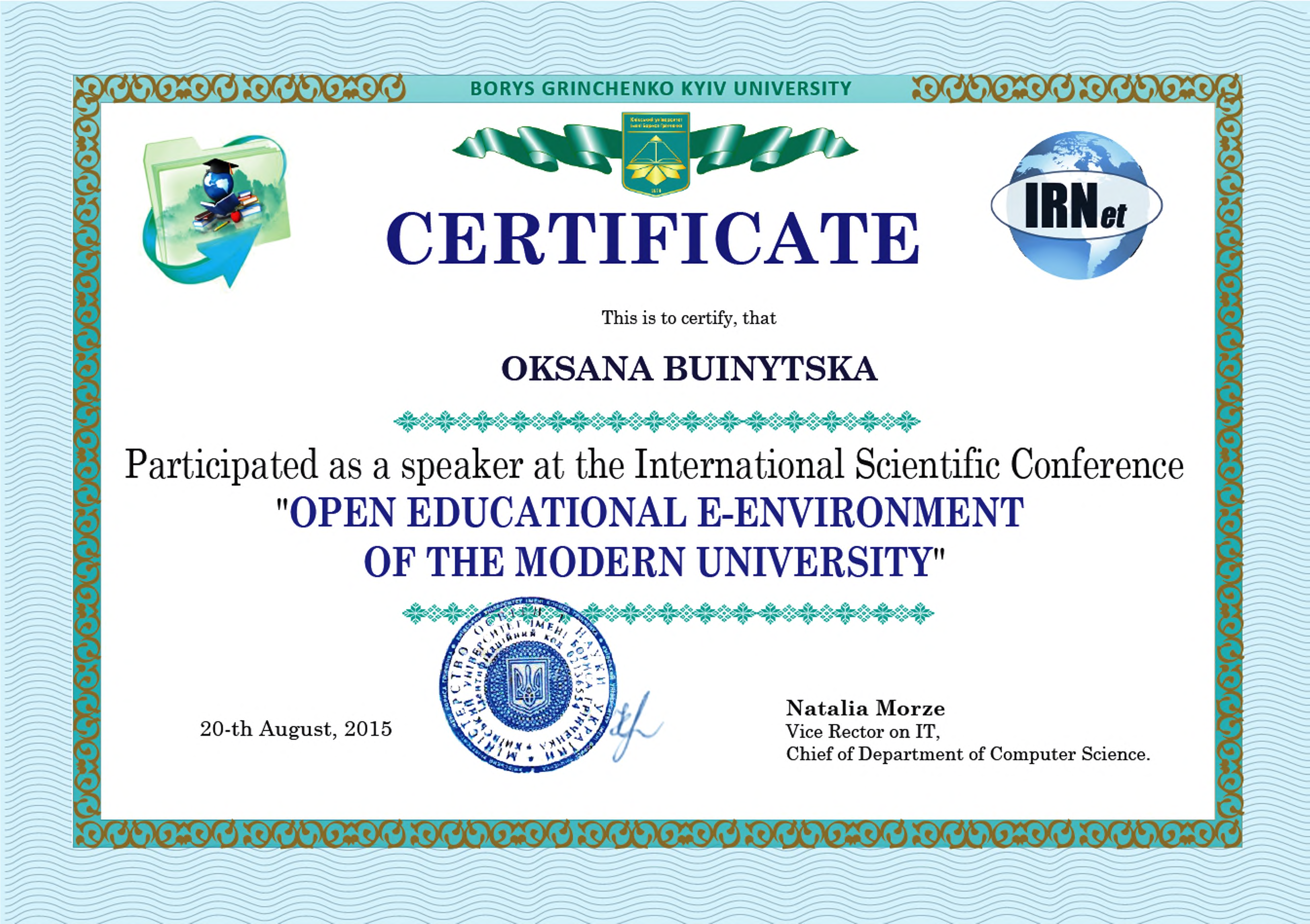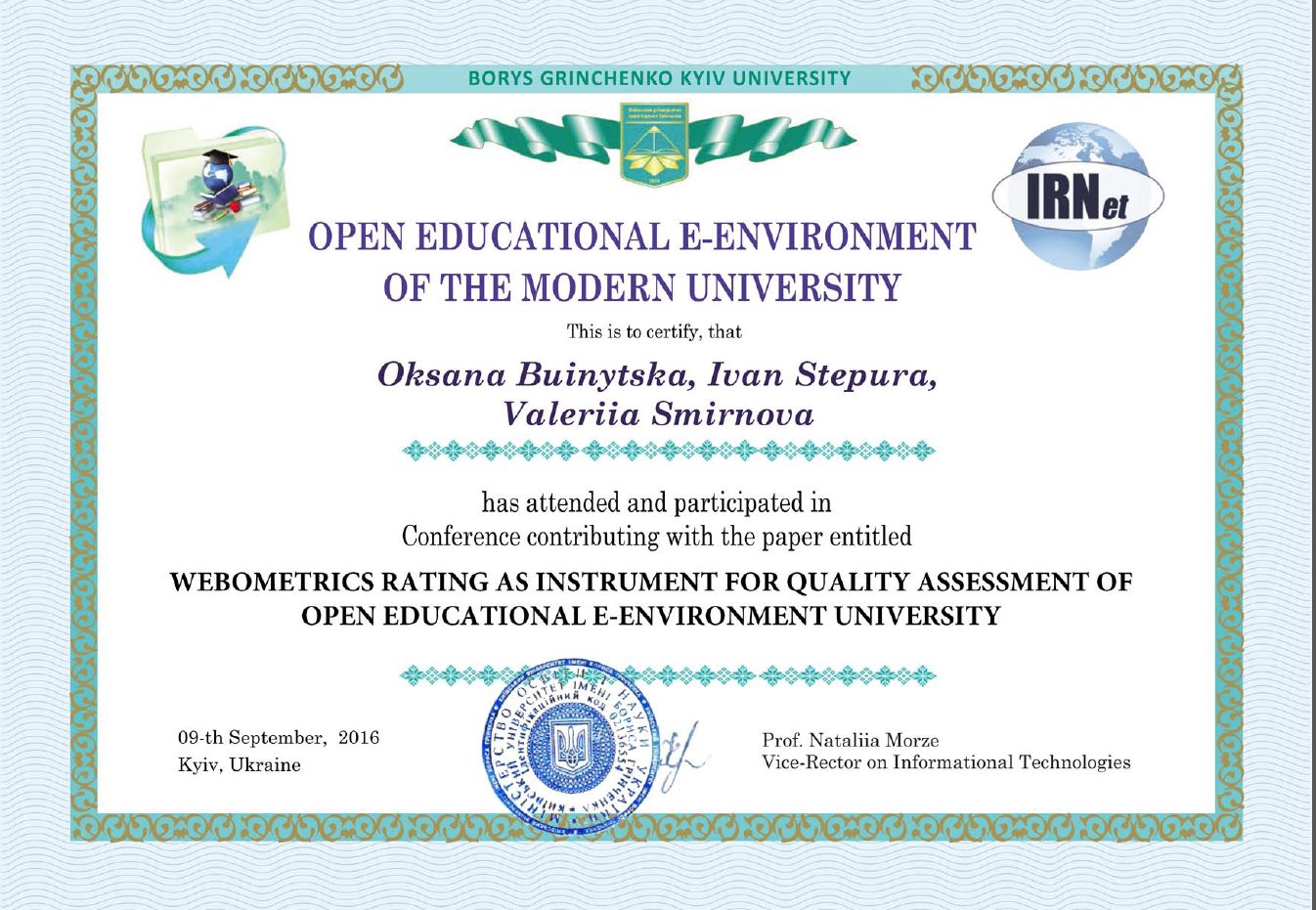 | 1302 | Open educational e-environment of modern University. II International Scientific Conference | 1. Webometrics Rating as Instrument for quality assessment of open Educational E-environment University. 2. Підготовка менеджерів електронного навчання | Kyiv |