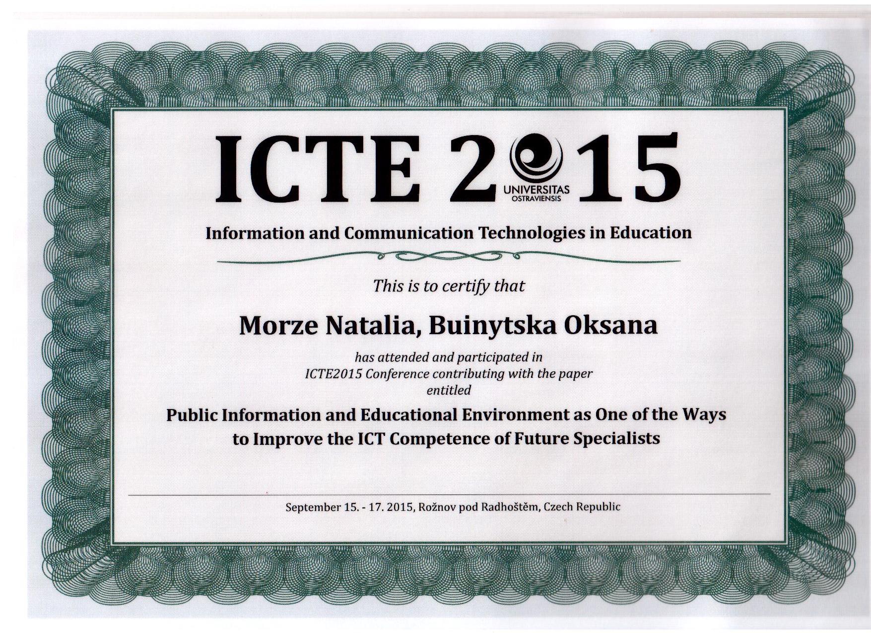| 1300 | Information and Communication Technology in Education (ICTE 2015) | PUBLIC INFORMATION AND EDUCATIONAL ENVIRONMENT AS ONE OF THE WAYS TO IMPROVE THE ICT COMPETENCE OF FUTURE SPECIALISTS | Ostrava, Czech Republic |