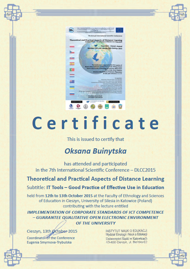 | 1301 | Theoretical and Practical Aspects of Distance Learning: 7th International Scientific Conference DLCC2015. Subtitle: IT Tools – Good Practice of Effective Use in Education | Implementation of corporate standards of ict competence – guarantee qualitative open electronic environment of the university | Katowice, Poland |