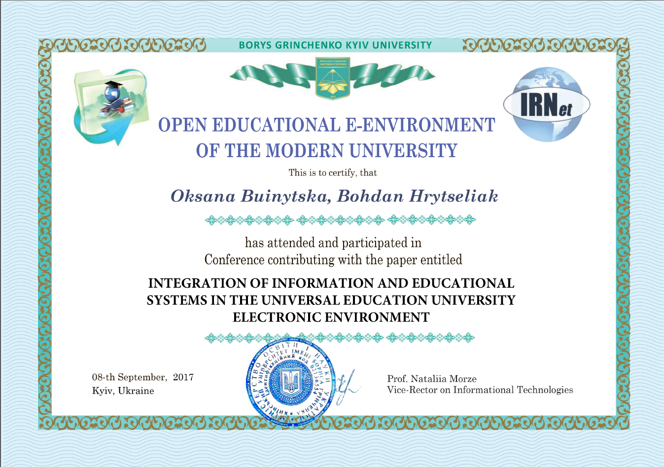 | 2917 | III International Scientific Conference : Open educational e-environment of modern University | Integration of information and educational systems in the universal education university electronic environment | Kyiv, BGKU |