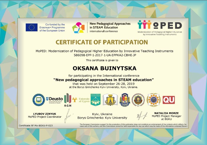 | 4615 | International Conference : New Pedagogical Approaches in STEAM Education (project MoPED) | Використання ЕНК для підвищення цифрової компетентності майбутніх учителів | Kyiv, BGKU |