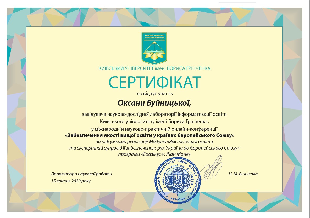 | 6310 | Науково-практична онлайн-конференція "Забезпечення якості освіти у країнах Європейського Союзу" | слухач | Київ, Київський університет імені Бориса Грінченка |