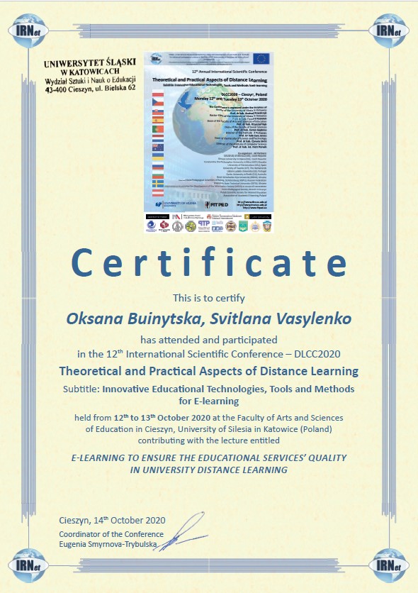 | 6312 | 12th International Scientific Conference DLCC2020. Subtitle: Innovative Educaonal Technologies, Tools and Methods for E-learning : Theoretical and Practical Aspects of Distance Learning | E-LEARNING TO ENSURE THE EDUCATIONAL SERVICES’ QUALITY IN UNIVERSITY DISTANCE LEARNING | Cieszyn-Katowice, Poland |