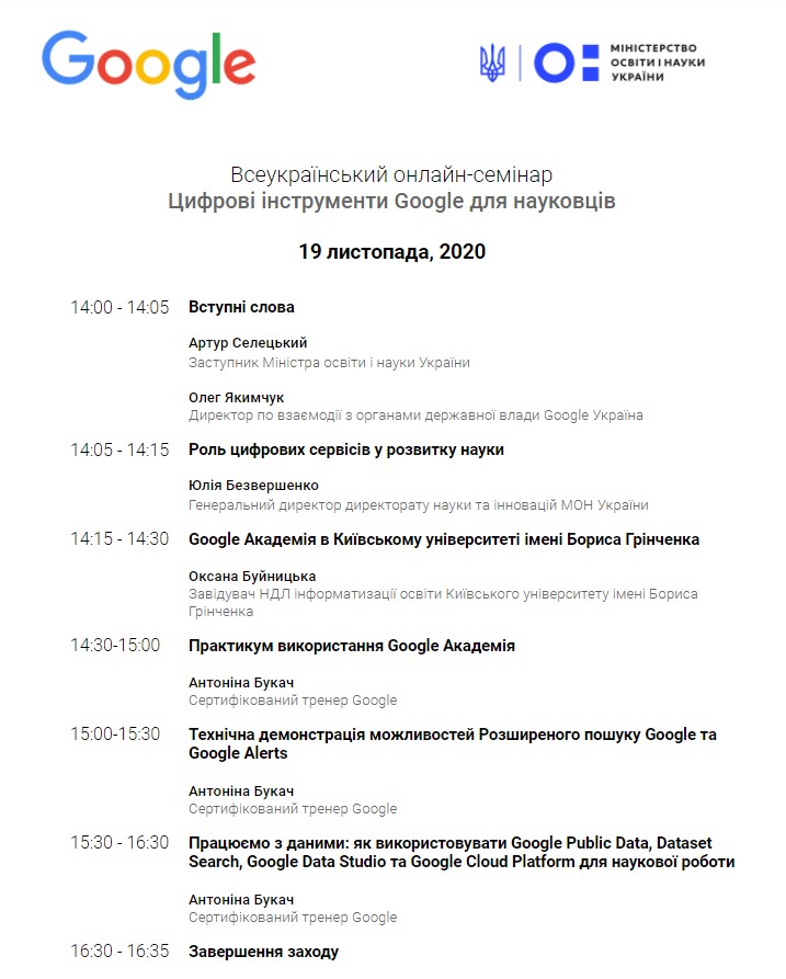 | 6313 | Цифрові інструменти Google для науковців: всеукраїнський онлайн-семінару | Google Академія в Київському університеті імені Бориса Грінченка | Київ |