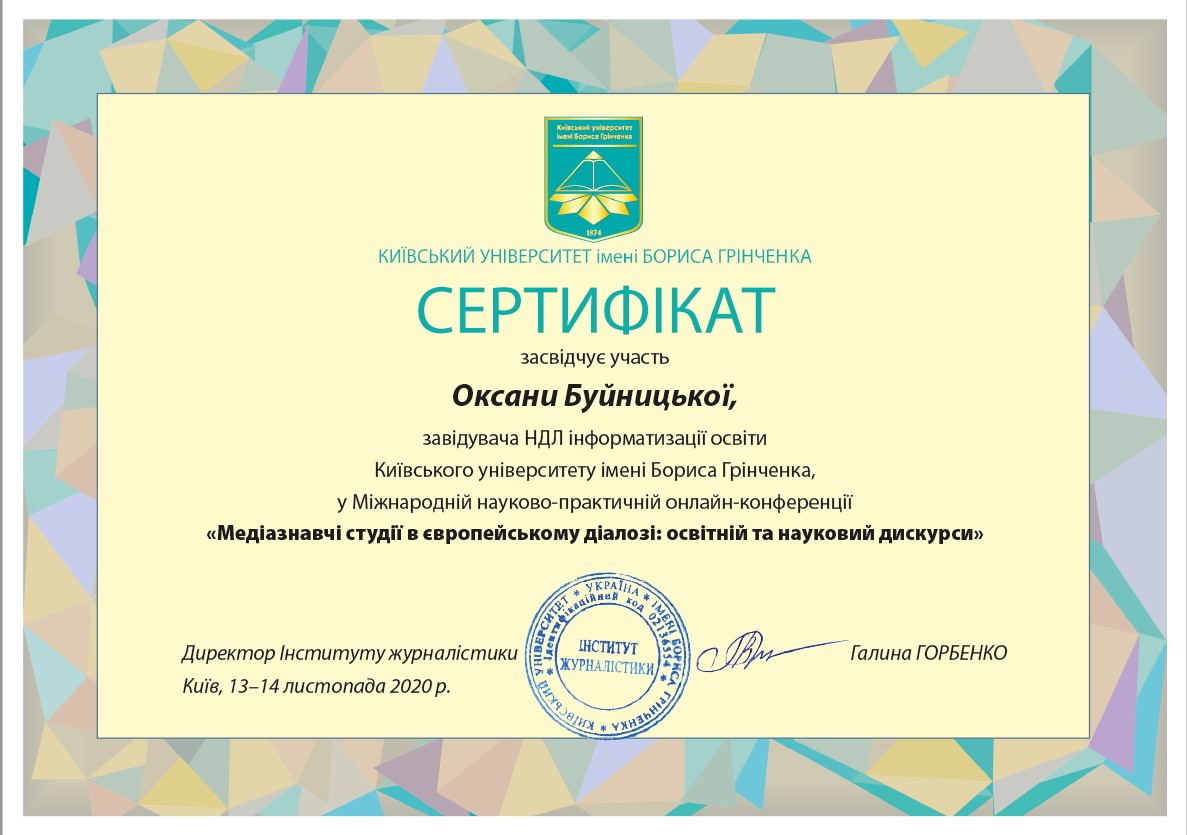 | 6315 | Медіазнавчі студії в європейському діалозі: освітній та науковий дискурси: Міжнародна науково-практична онлайн-конференція | слухач | Київ, онлайн |