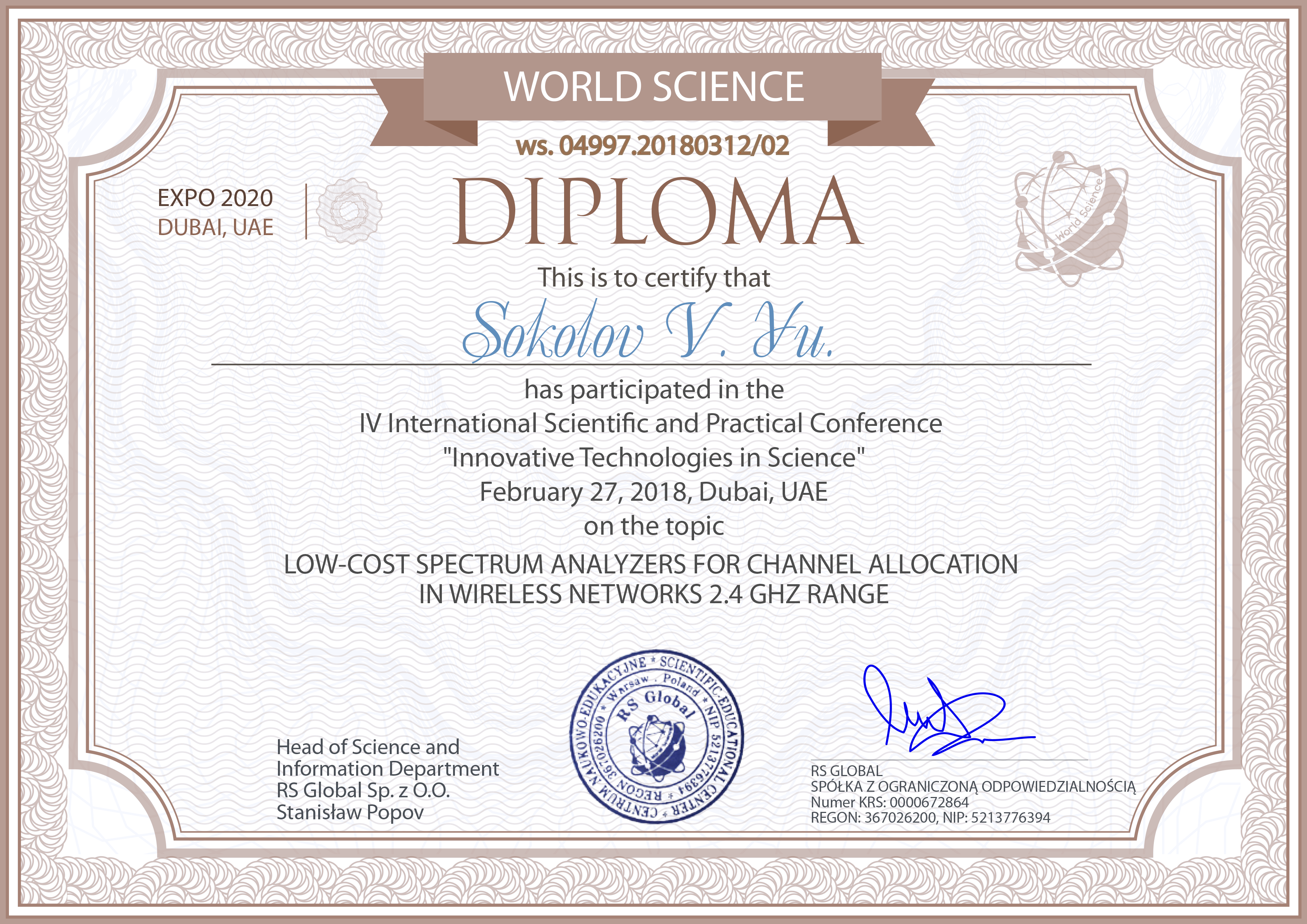 | 3396 | IV International Scientific and Practical Conference "Innovative Technologies in Science" | Low-Cost Spectrum Analyzers for Channel Allocation in Wireless Networks 2.4 GHz Range | Dubai |