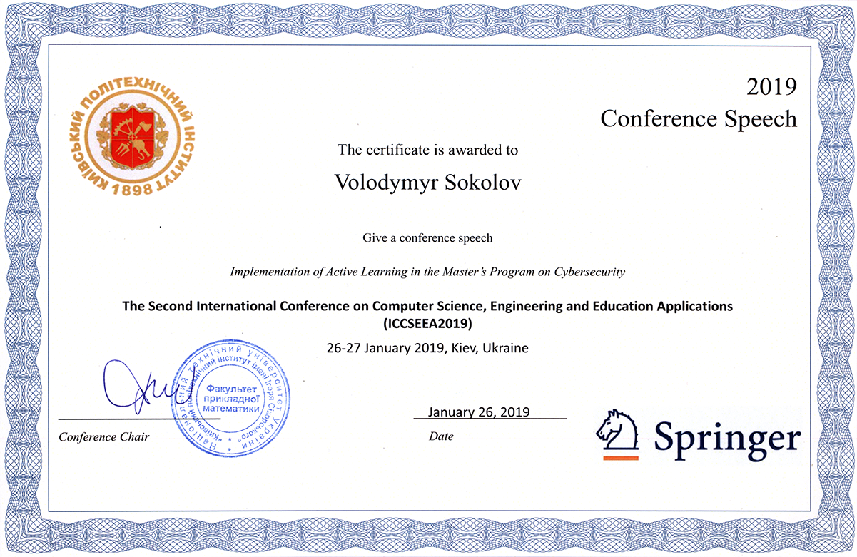 | 3995 | II International Conference on Computer Science, Engineering and Education Applications (ICCSEEA’2019) | Implementation of Active Learning in the Master’s Program on Cybersecurity | Kyiv |