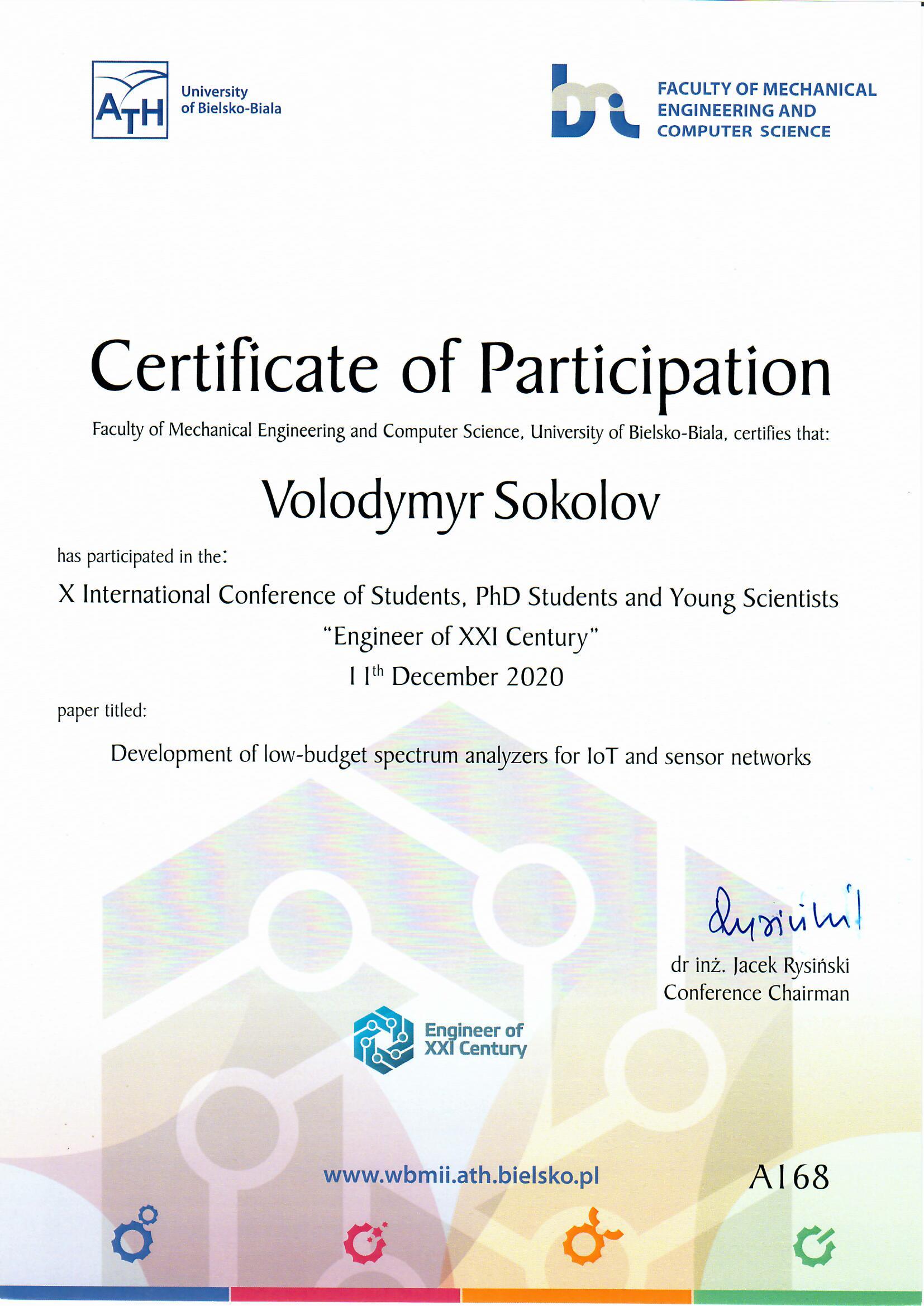 | 6879 | X International Conference "Engineer of XXI Century" | Development of low-budget spectrum analyzers for IoT and sensor networks | Bielsko-Biala, Poland |