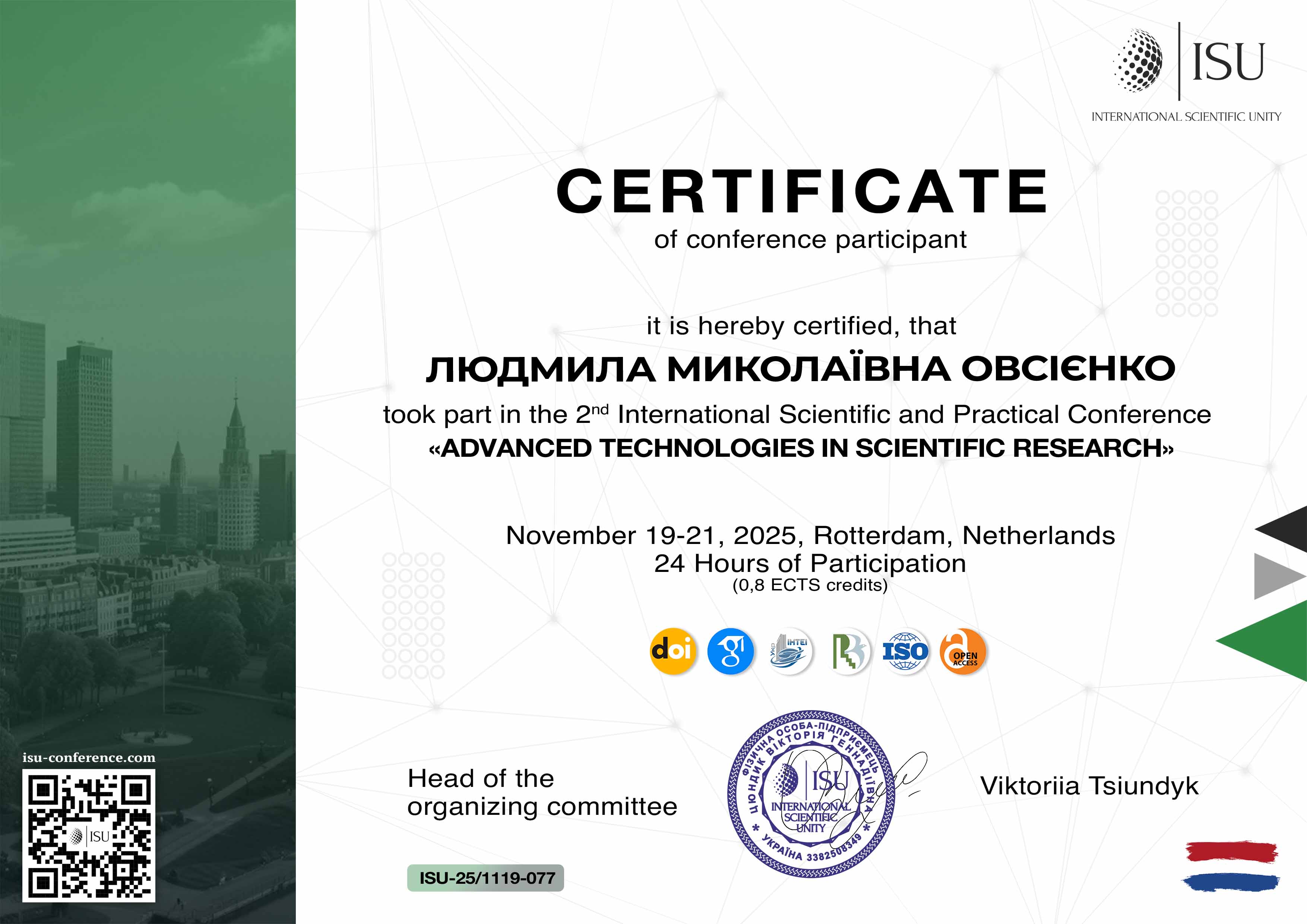 | 12511 | ІІ Міжнародна науково-практична конференція «Advanced Technologies in Scientific Research» | «Медіастилістика TikTok-епохи: нові норми, коди й культура сприйняття» | Роттердам, Нідерланди |