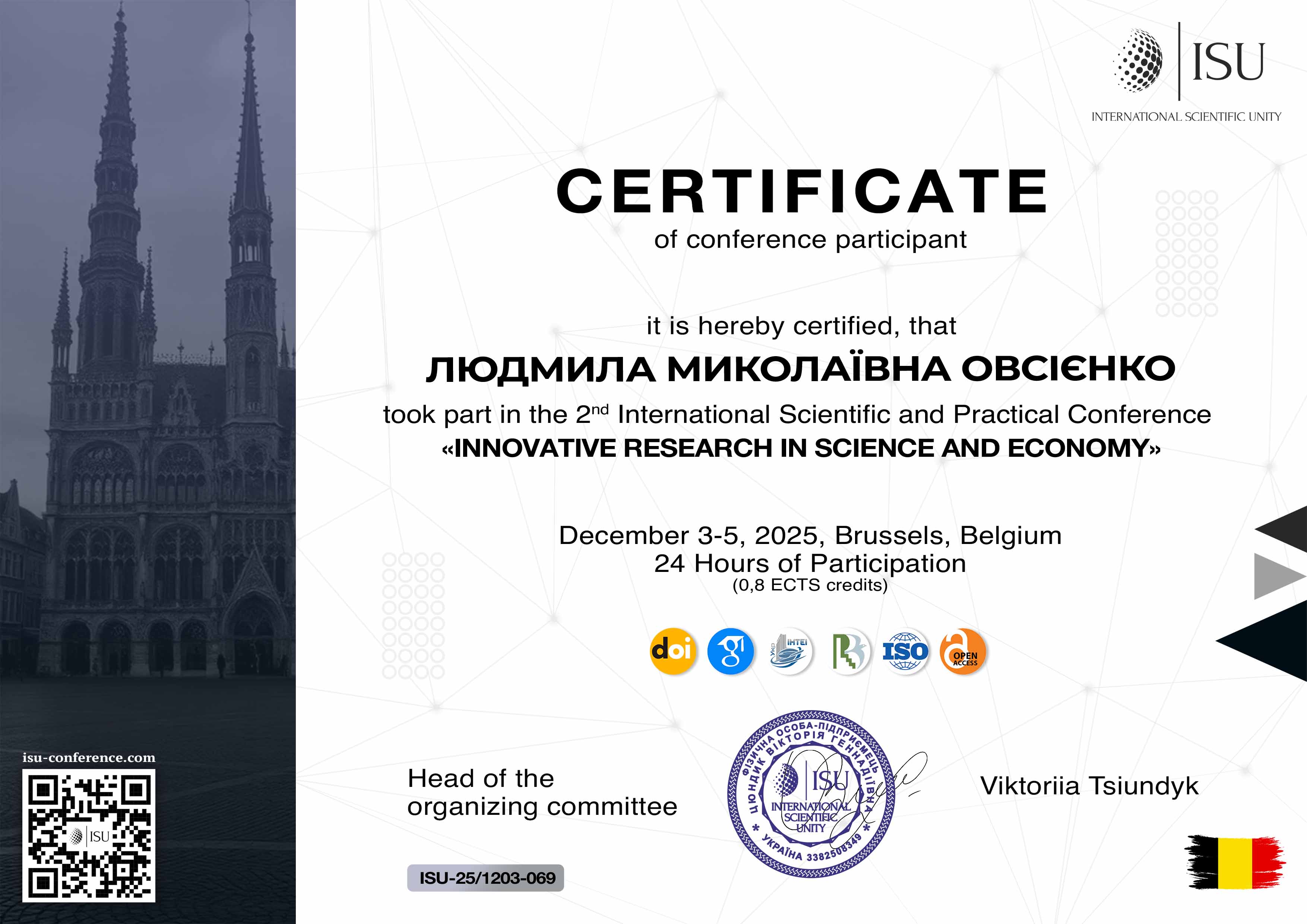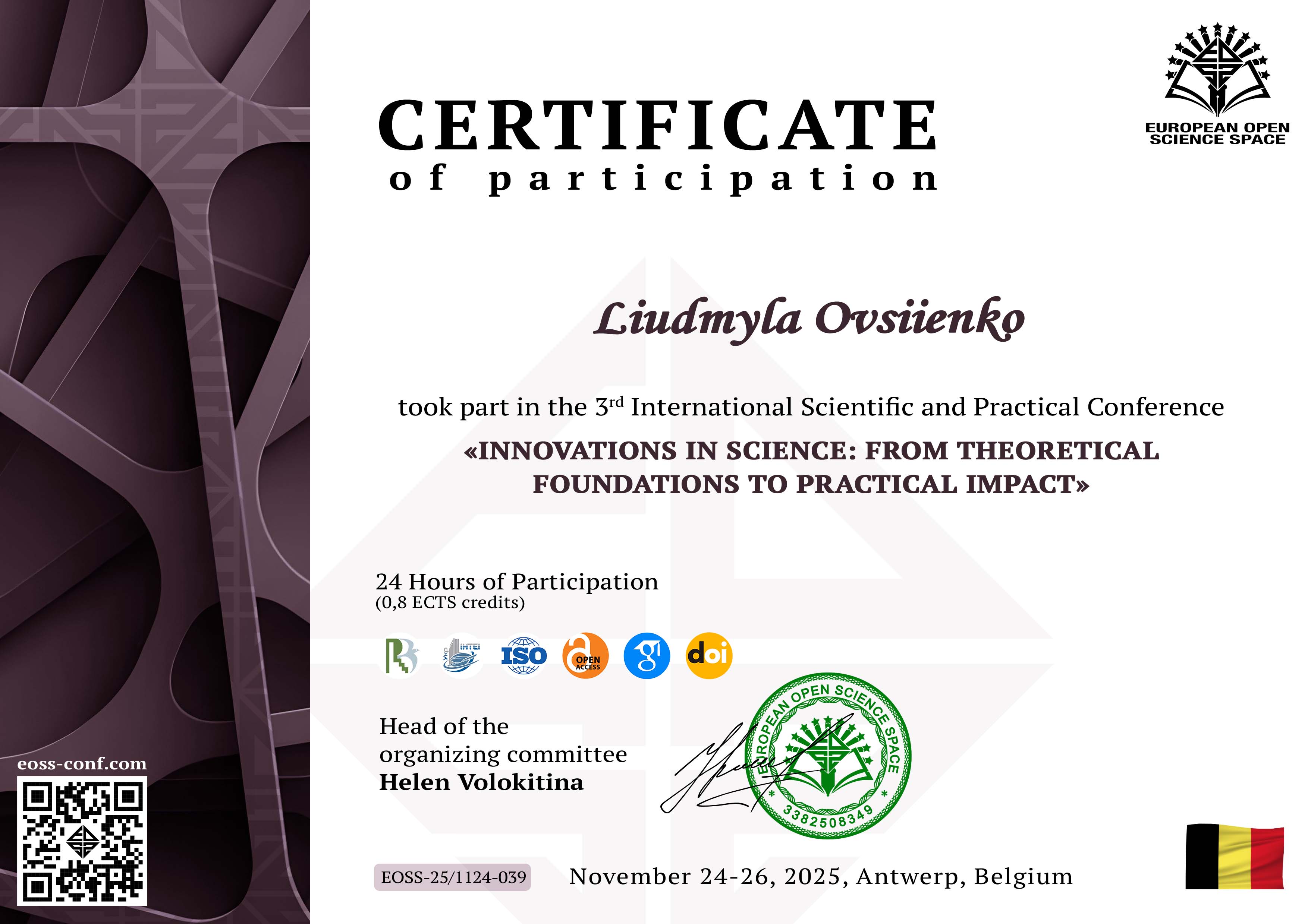 | 12542 | ІІІ Міжнародна науково-практична конференція «Innovations in Science: From Theoretical Foundations to Practical Impact» | «Еволюція стилю українських журналістських текстів під впливом соціальних мереж» | Антверпен, Бельгія |