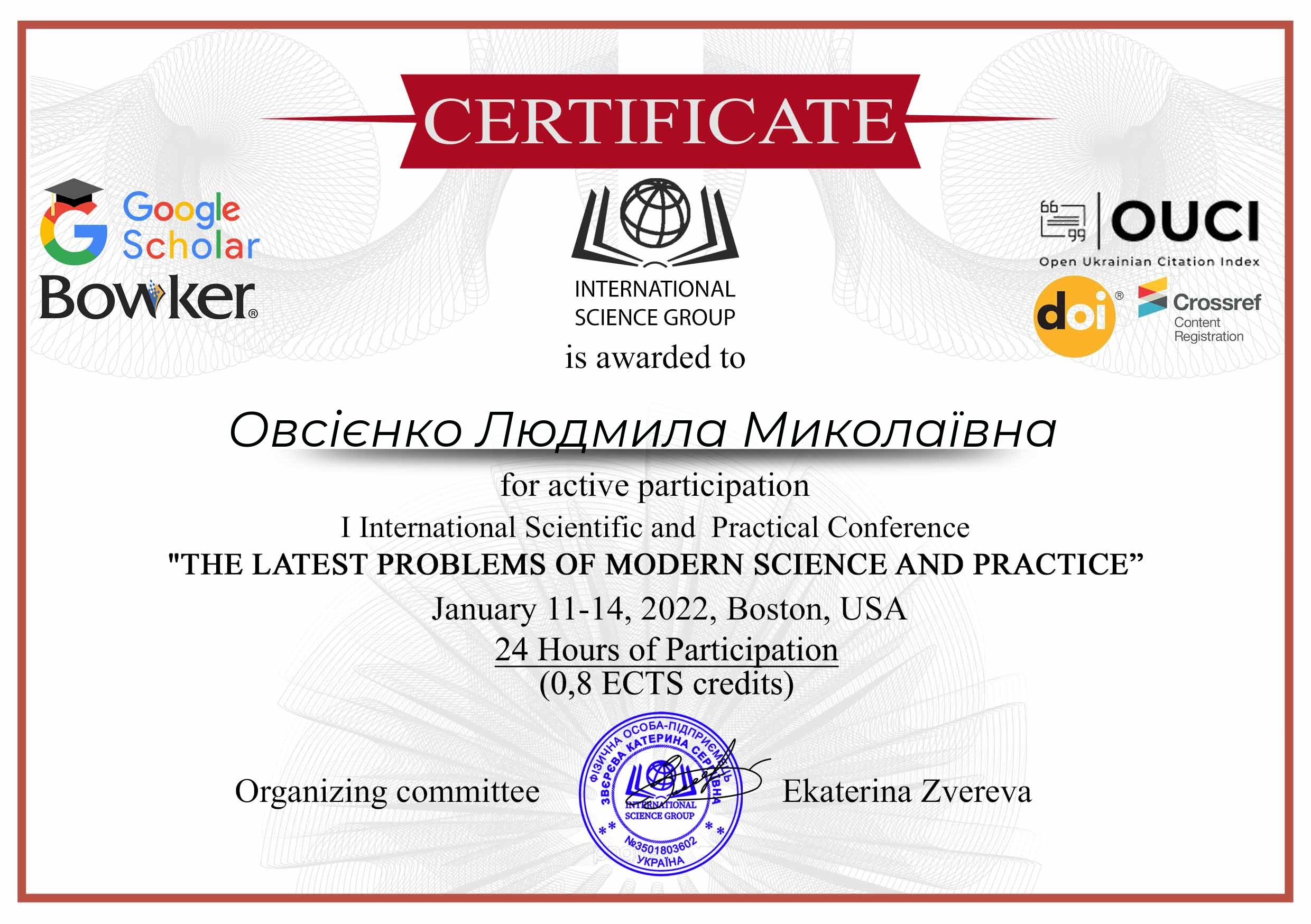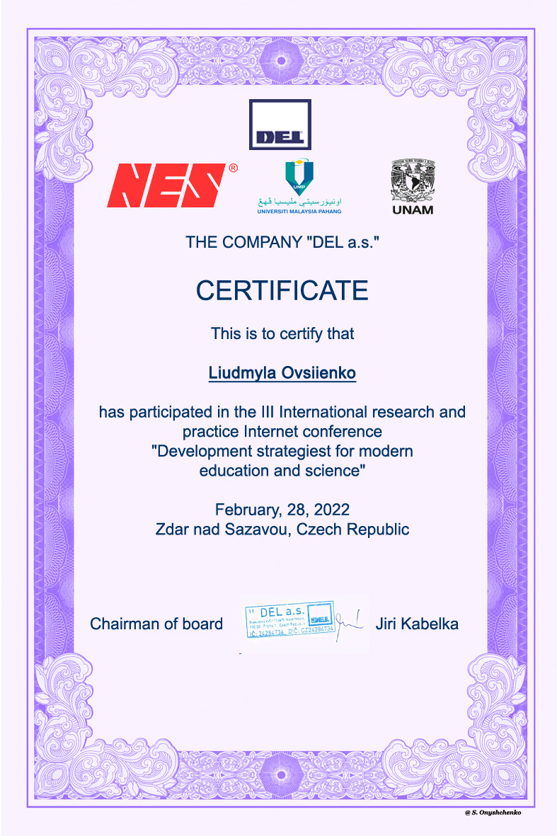 | 8393 | The III International Research and Practical Internet Conference "Development strategiest for modern education and science" | "Термінологія: розмежування визначень" | Žďár nad Sázavou, Czech Republik |