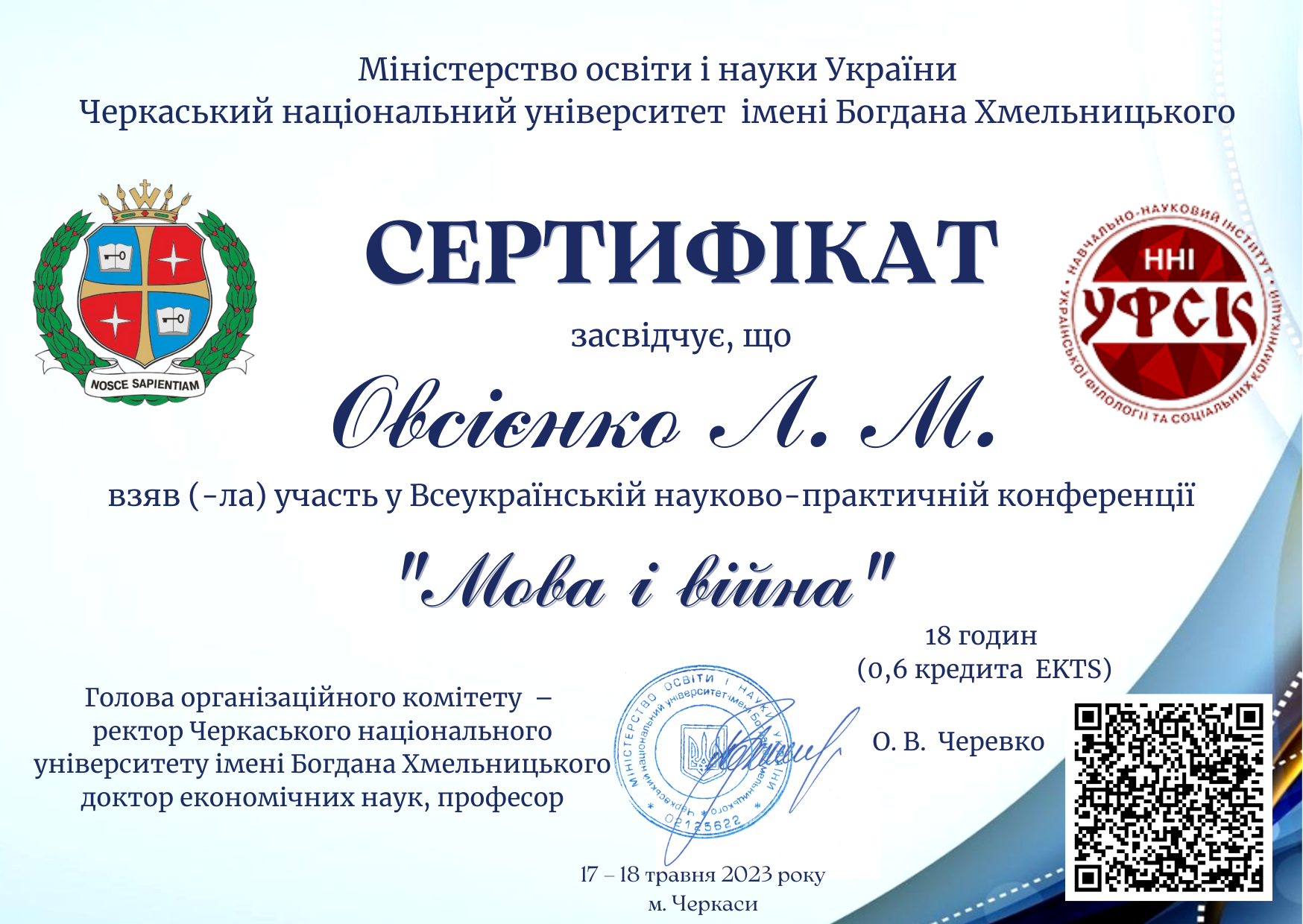 | 9419 | Всеукраїнська науково-практична конференція «Мова і війна» | «Військова лексика в міжособистісному спілкуванні молоді» | м. Черкаси, Україна, Черкаський національний університет імені Богдана Хмельницького |