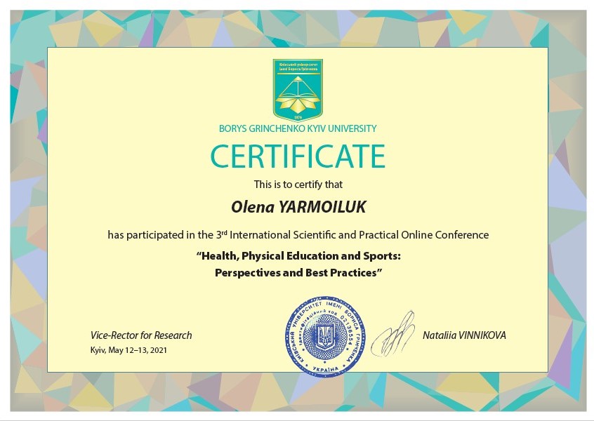 | 12049 | V міжнародна науково-практична онлайн-конференція «ЗДОРОВ’Я, ФІЗИЧНЕ ВИХОВАННЯ І СПОРТ: ПЕРСПЕКТИВИ ТА КРАЩІ ПРАКТИКИ» | без доповіді | Київ, Україна | document.pdf | |