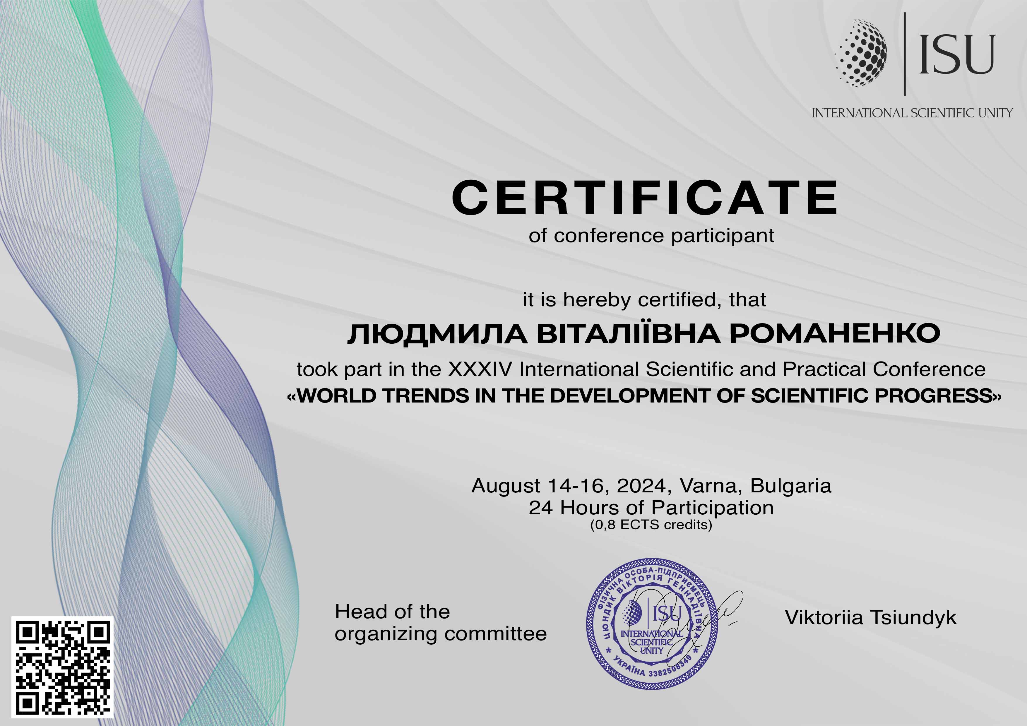| 11151 | XXXІV International scientific and practical conference «World Trends in the Development of Scientific Progress» | Розроблення учнями 3-4 класів коміксів на уроках «Я досліджую світ» з використанням сервісу Canva як наукова проблема | Varna, Bulgaria. |