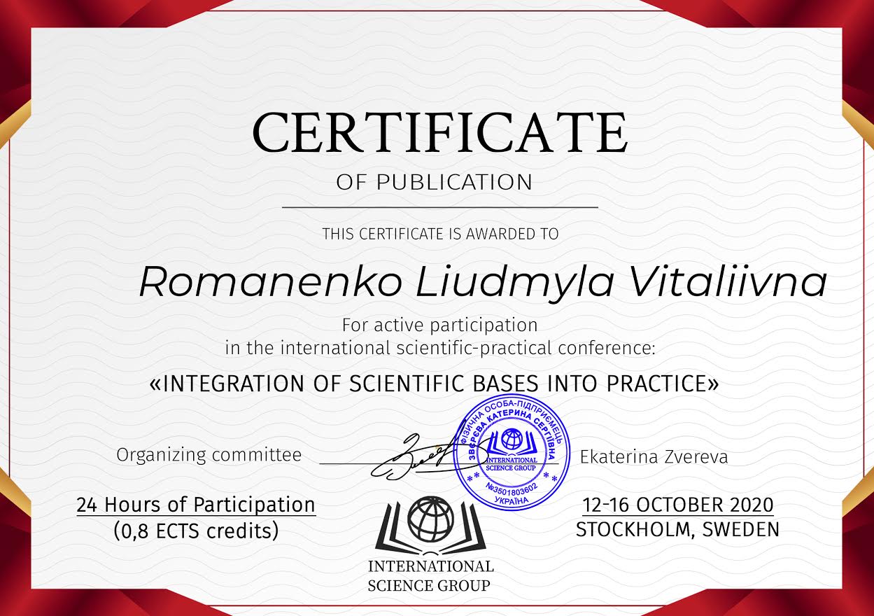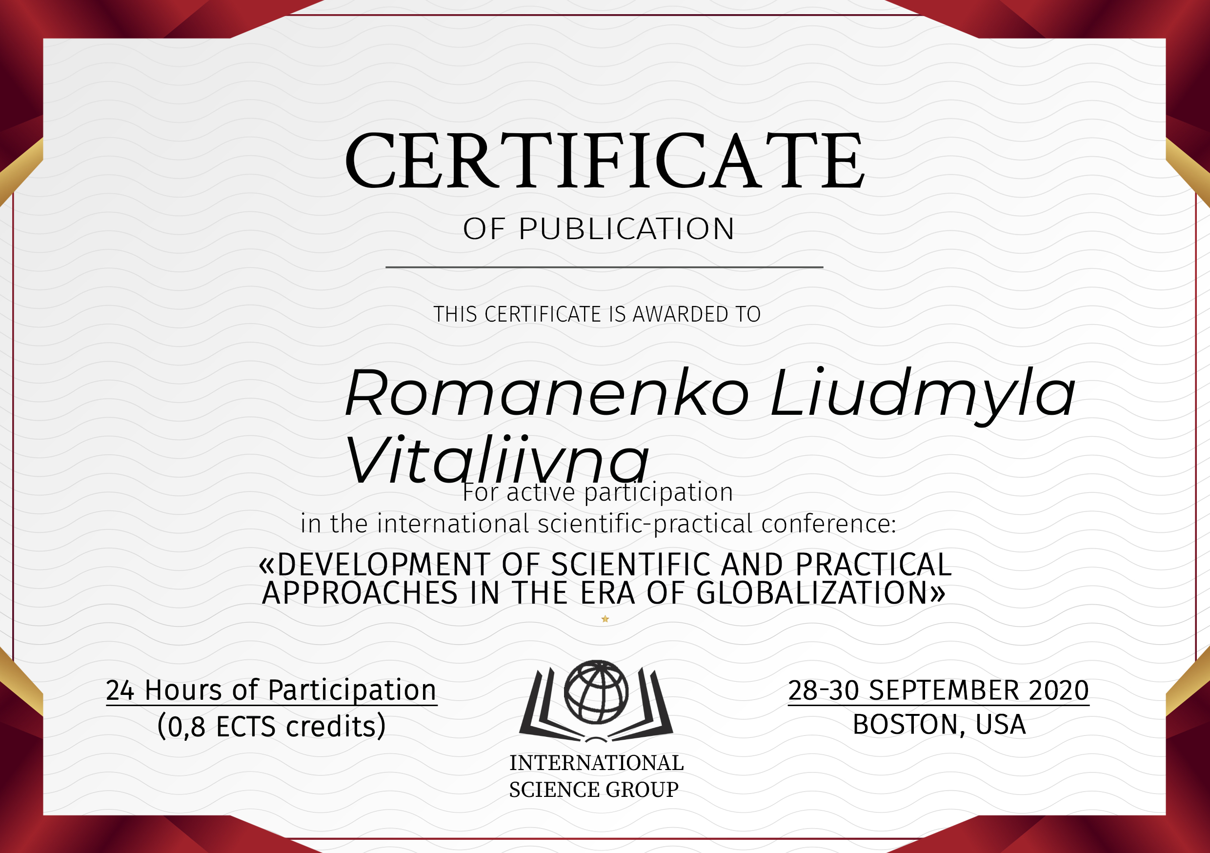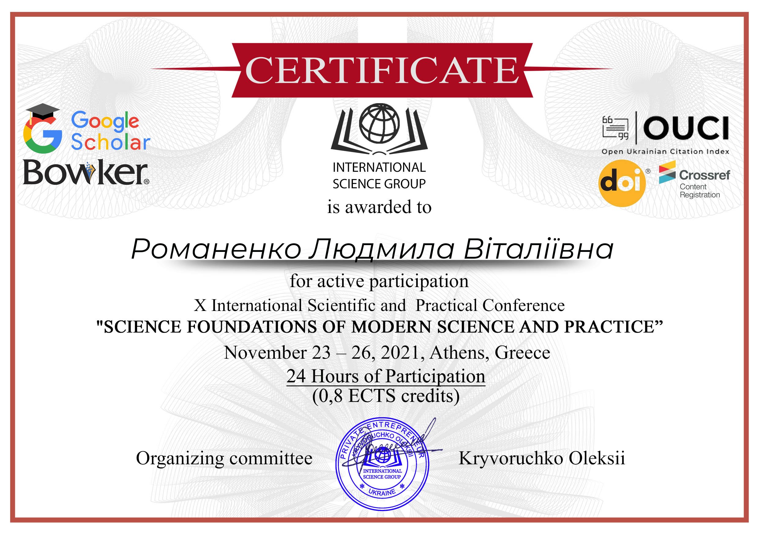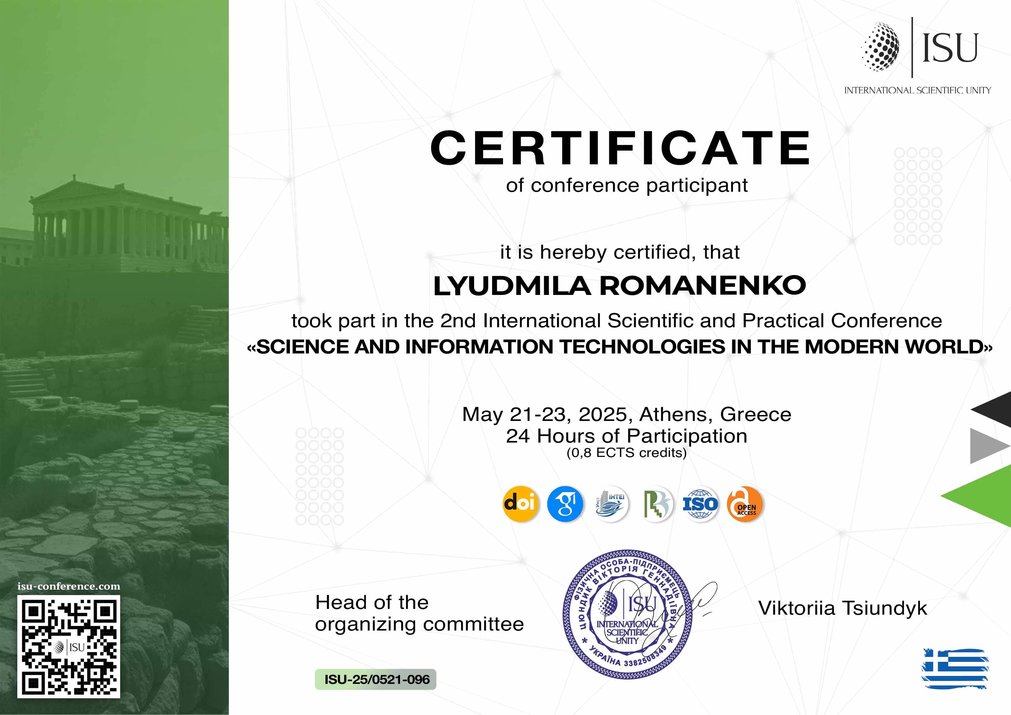 | 7396 | X Міжнародна науково-практична конференція «SCIENCE FOUNDATIONS OF MODERN SCIENCE AND PRACTICE» | Можливості сервісу CLASSROOMSCREEN для організації дистанційного навчання учнів | Athens, Greece |