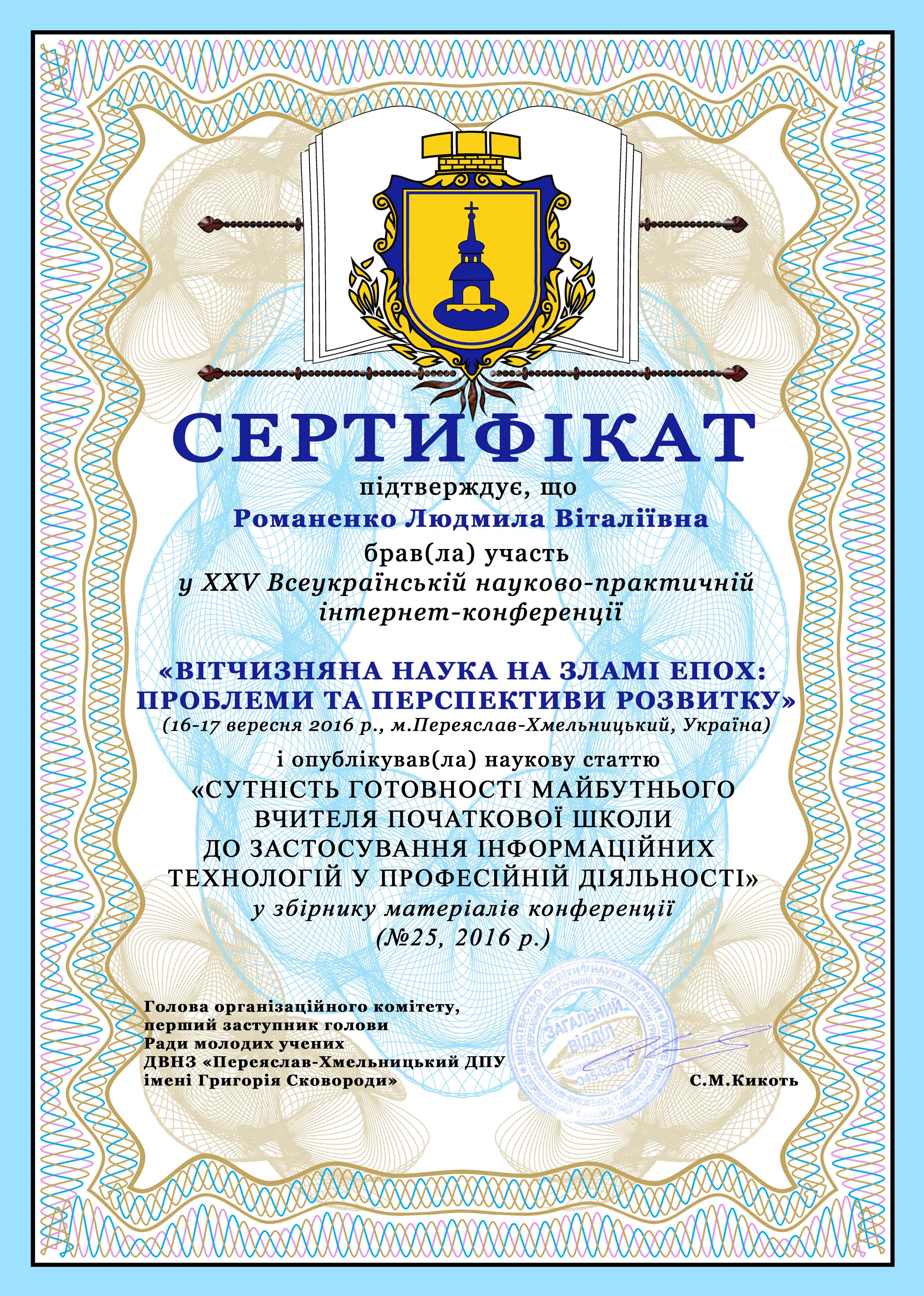 | 1386 | XXV Всеукраїнська науково-практична інтернет-конференція "Вітчизняна наука на зламі епох: проблеми та перспективи розвитку" | Сутність готовності майбутнього вчителя початкової до застосування інформаційних технологій у професійній діяльності | ДВНЗ "Переяслав-Хмельницький ДПУ імені Григорія Сковороди" |