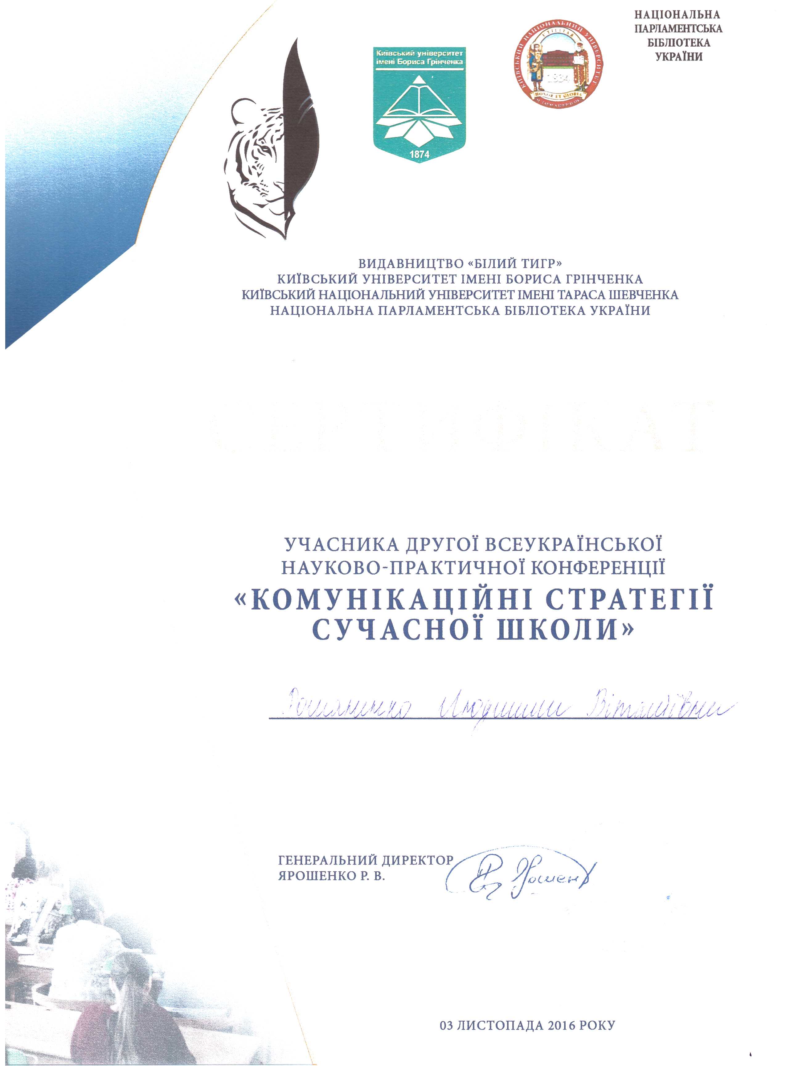 | 1389 | ІІ Всеукраїнська науково-практична конференція "Комунікативні стратегії сучасної школи" | Формування предметної математичної компетентності молодшого школяра засобом ІКТ | Національна парламентська бібліотека України, м.Київ |